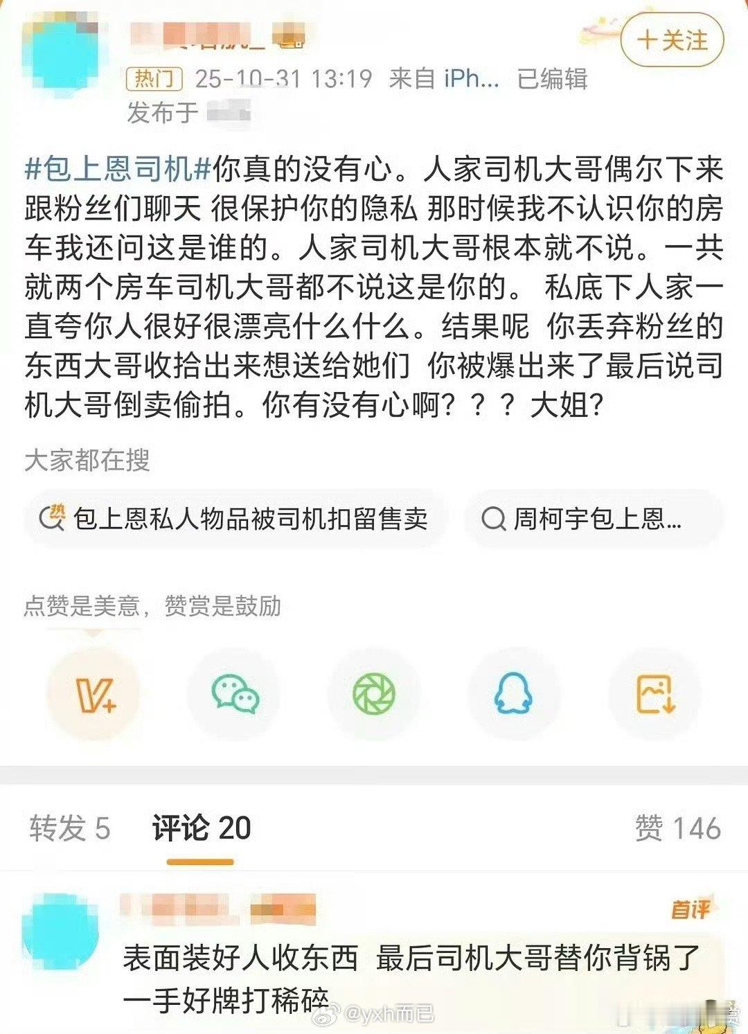 包上恩司机果然翻车了 我就说图上那些东西哪有什么珍贵物品,肯定是把粉丝给的不值钱的东西丢了被粉丝发现了,于是找了一个背锅的,还让人家司机大叔写道歉信,粉丝们真的不要送那些小玩意了,明星只会觉得是累赘,即使是信也没几个打开的,估计家里都有一台碎纸机[偷乐] 包上恩粉丝为司机发声