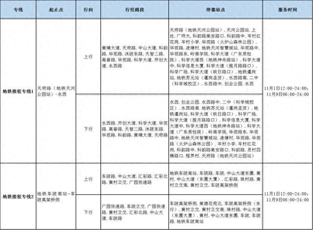 上述2条地铁接驳专线开行时间为11月1日12:00至24:00、11月9日06:00至24:00。此外,市交通运输部门还将重点加密天河区、黄埔区科学城区域常规公交发班班次,提升地面公交服务能力。