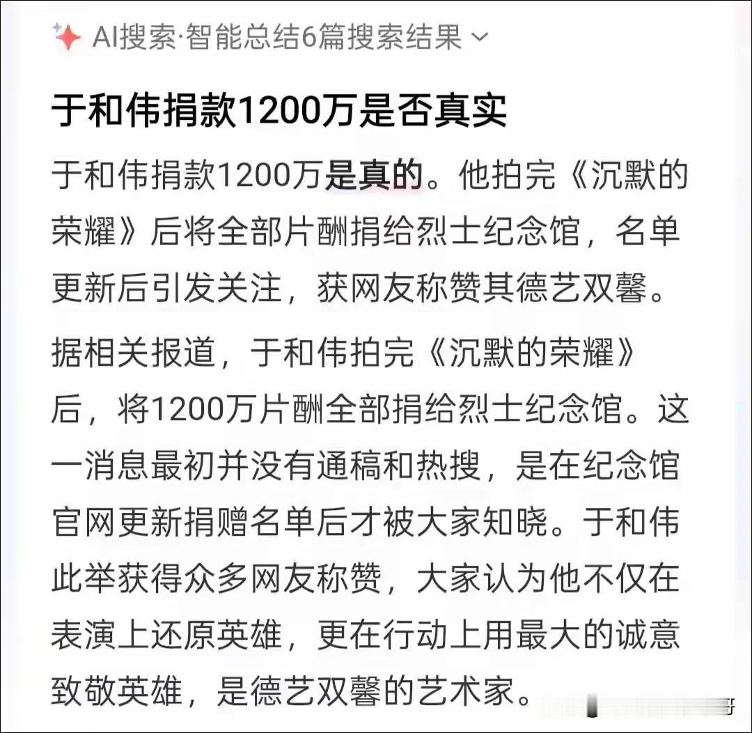 于和伟是一名非常有影响力,造诣也非常深厚的演员,自从央视热播沉默的荣耀之后呢,很多人都对于和伟的演技重新刷新了认知,对于于和伟老师也表达了崇高的敬意,因为他演的就是吴石将军的原型,最近呢有人说这个吴石将军烈士纪念馆收到匿名1200万的捐款,据说是于和伟老师拍摄沉默的荣耀的片酬全部捐给了吴石将军烈士纪念馆,但是目前得到福建和北京的回应,均没有听说过此事啊,具体是否落地,还要看于和伟老师愿不愿意公开这这批捐赠,因为有很多人做好事,不太喜欢张扬。我相信他可能会这样做,但是如果人家不捐我们也不要道德绑架这样对他来说是不公平的他毕竟在拍摄的过程中