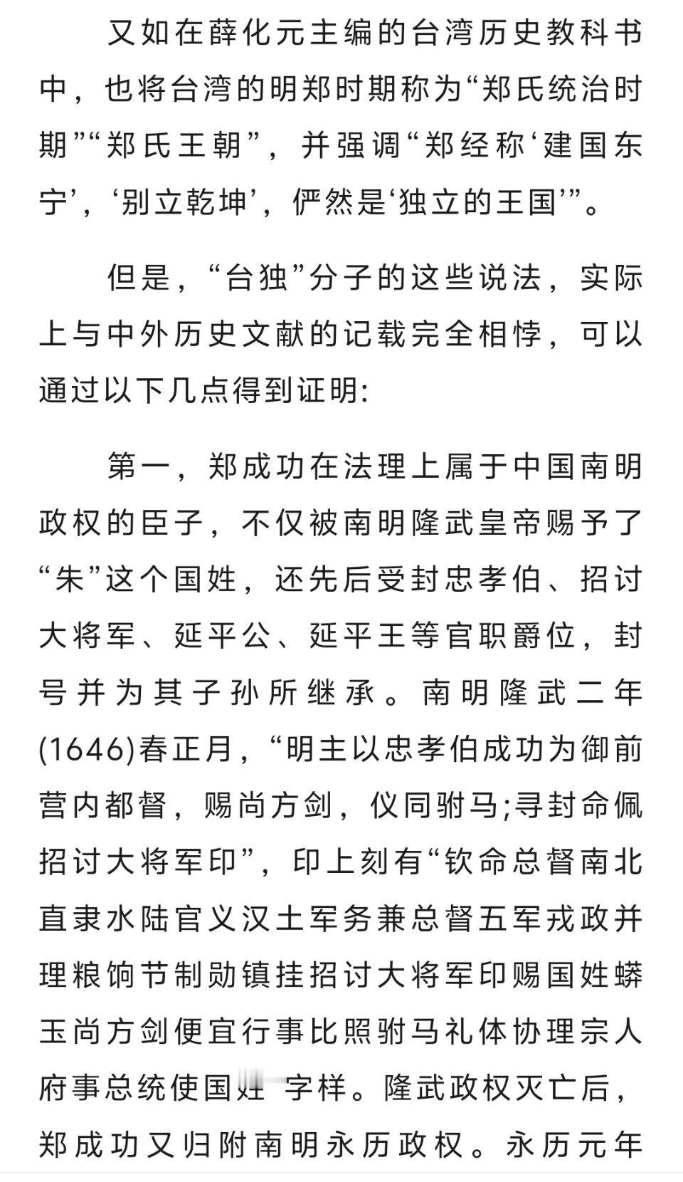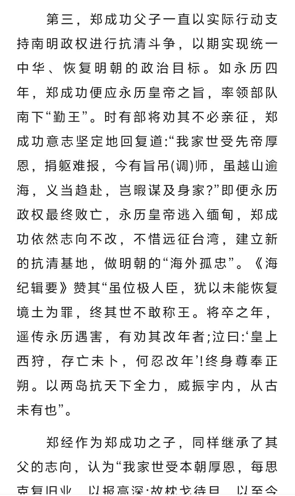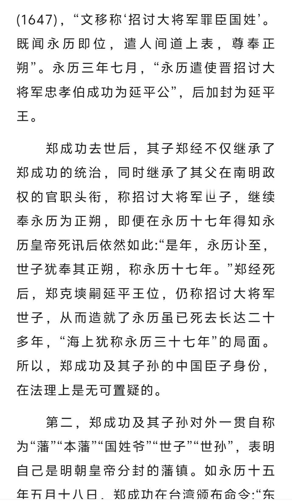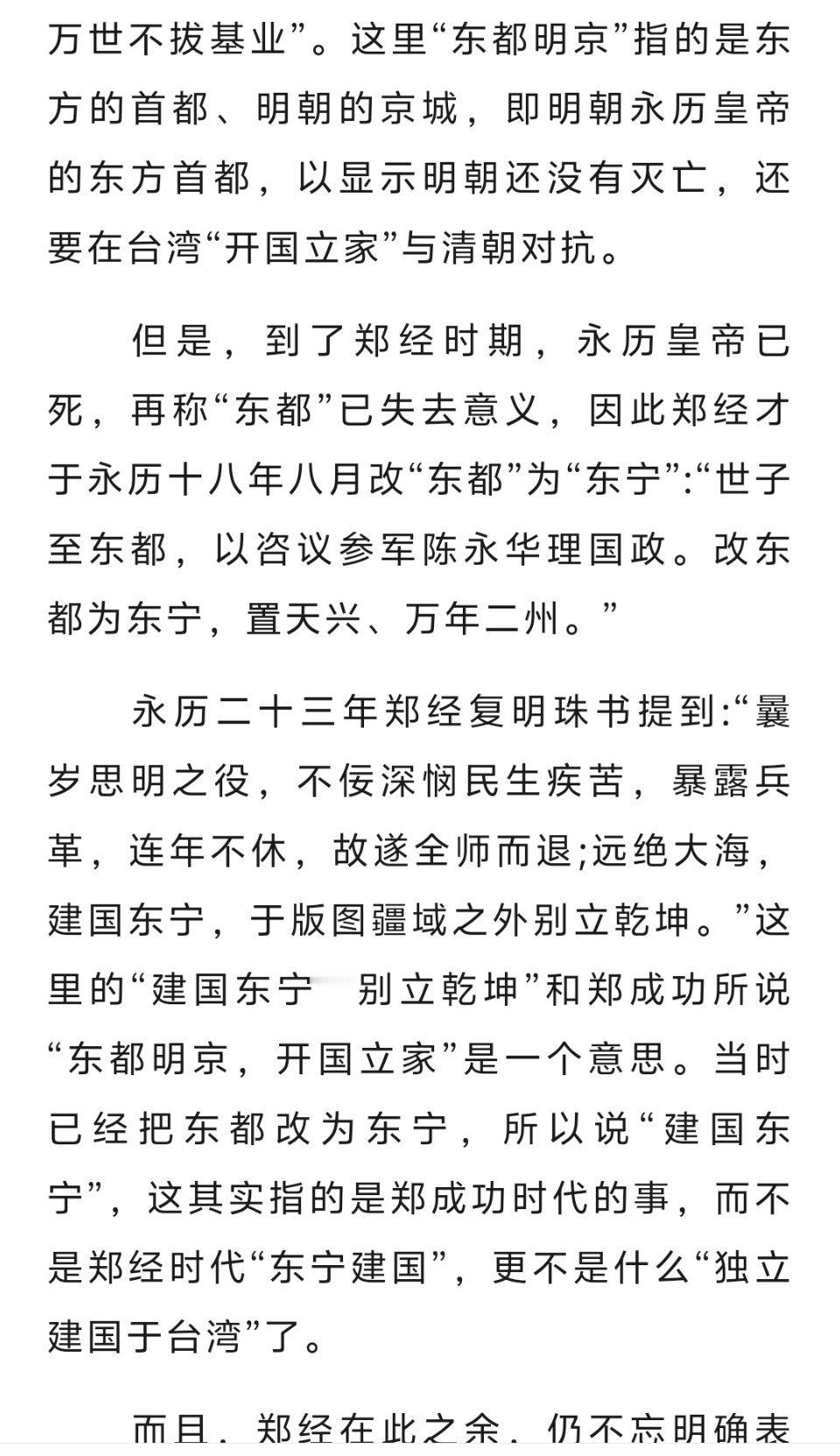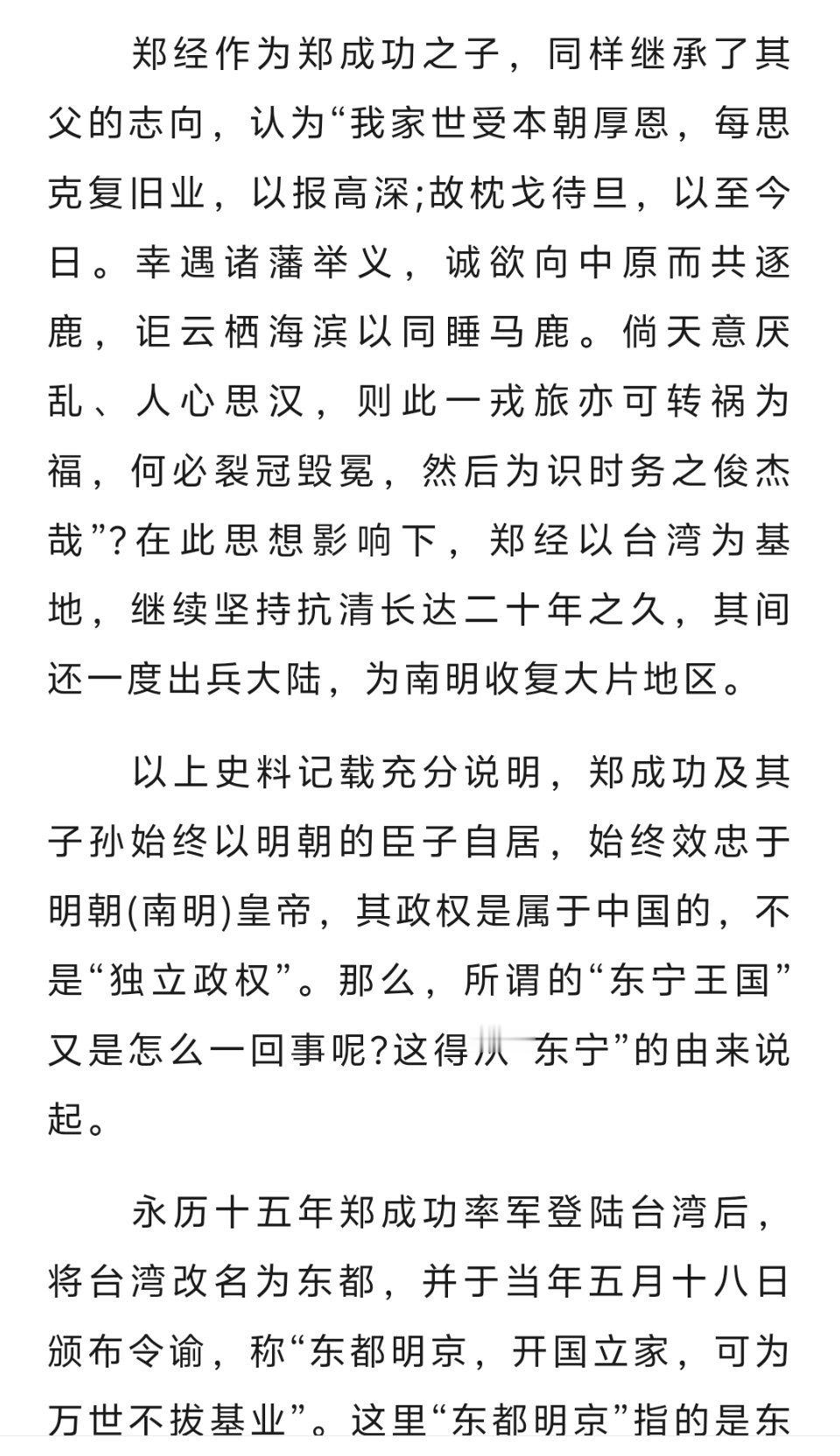 郑成功及其子孙都是以明朝臣子自居,奉明朝正统,从未独立建国。可以看下厦门大学陈孔立教授2024年发表的文章。有些人嘴里的“东宁王国”实际指的是东都明京,明朝东方的首都,显示明朝还未灭亡,要迎接永历帝。后来永历帝去世才改东宁。并且郑成功的儿子郑经也是不忘国恩,秉承先王之训。有些人不要历史虚无主义,给大明孤忠泼脏水。