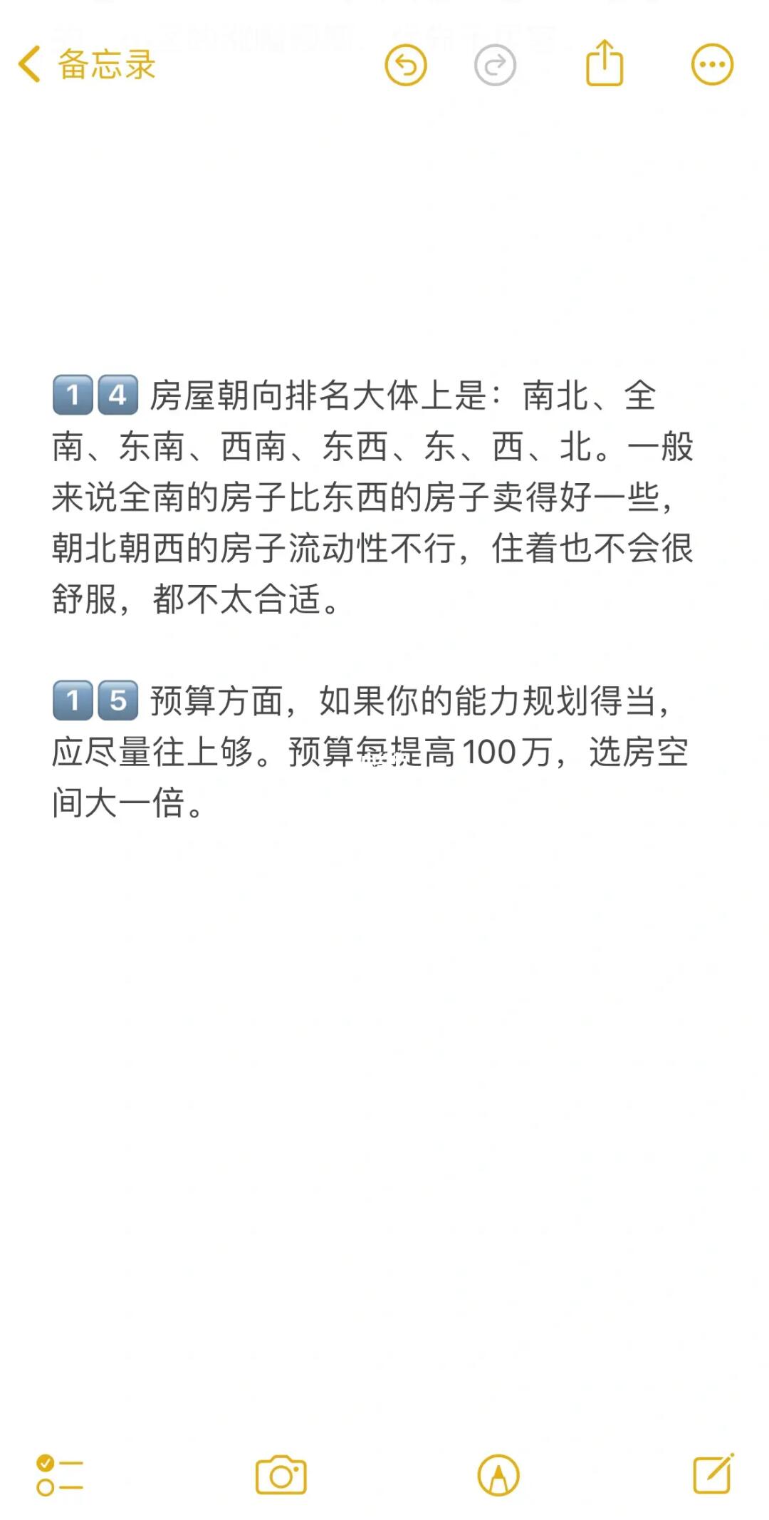 1️⃣4️⃣ 房屋朝向排名大体上是:南北、全南、东南、西南、东西、东、西、北。一般来说全南的房子比东西的房子卖得好一些,朝北朝西的房子流动性不行,住着也不会很舒服。