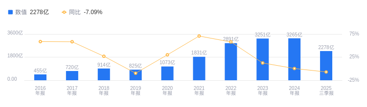 2025年三季度,荣盛石化营业收入达2278.15亿元,行业排名3/10,高于行业平均数4939.04亿元和中位数880.24亿元,但与第一名中国石油21692.56亿元、第二名中国石化21134.41亿元仍有差距。当期净利润为26.28亿元,行业排名4/10,低于行业平均数180.48亿元,高于中位数1.76亿元,行业第一名中国石油净利润为1401.14亿元,第二名中国石化为340.33亿元。