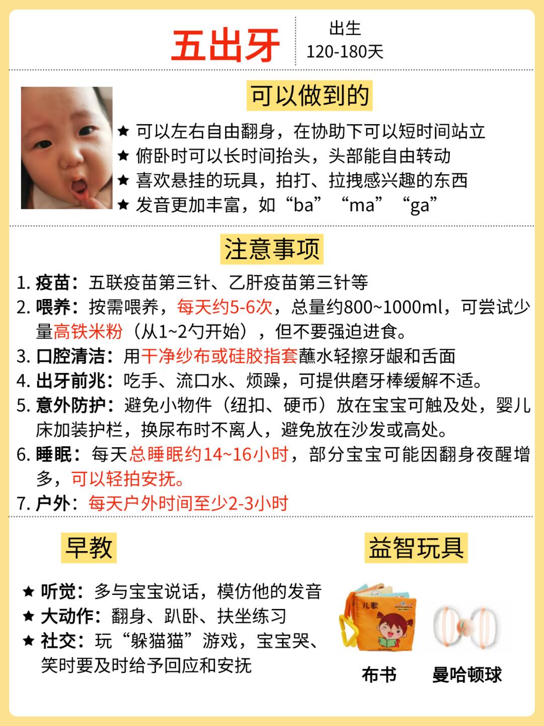 ✅五出牙:宝宝开始萌出牙齿,牙龈会肿痛,可以给宝宝吃冷藏的牙胶缓解不适