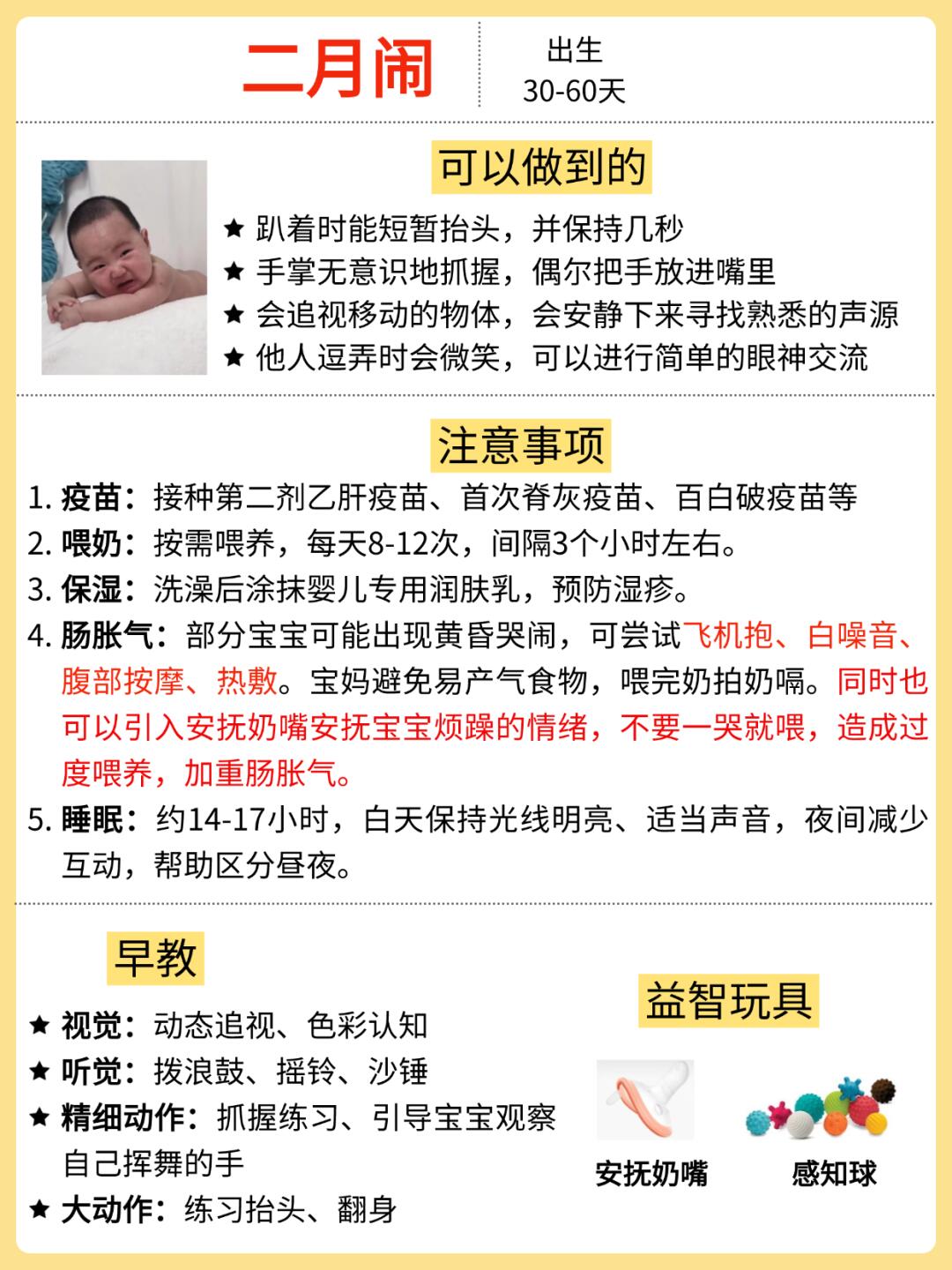 ✅二月闹:宝宝会出现肠胀气/肠绞痛,坚持给宝宝拍嗝和做排气操,实在安抚不了可以引入安抚奶嘴安抚宝宝情绪
