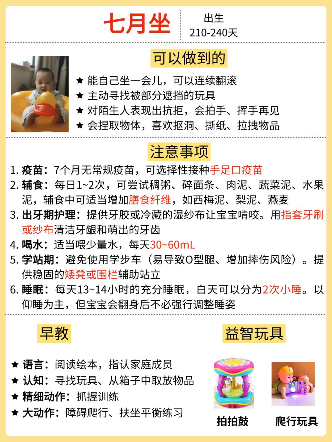 ✅七月坐:宝宝能独坐一会儿,会认人,能听懂自己的名字