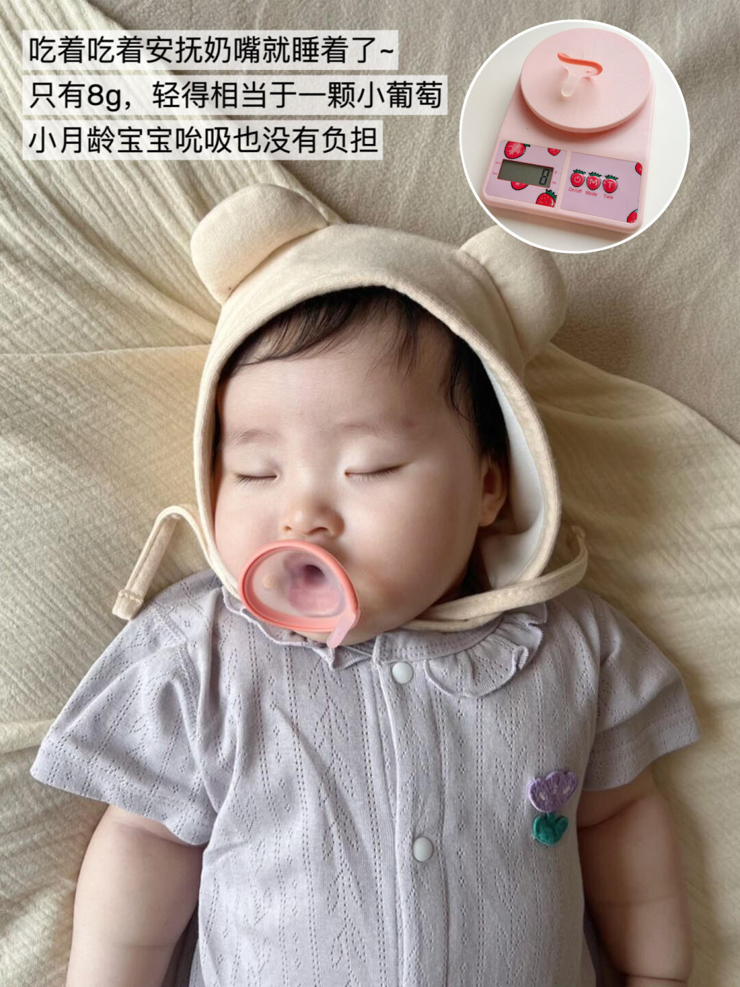 它是液态硅胶一体成型设计,柔软安全;仿拇指设计,宝宝像在吮吸自己的小手,不易产生R头混淆;还是不贴面的设计,与唇周保持微距,不仅防窒息还不压宝宝口鼻、摩擦宝宝皮肤,爱流口水的宝宝不用担心闷出口水疹。它的总重量只有8g,相当于一颗葡萄哦!宝宝衔着不费力,夜间惊醒塞上安抚奶嘴,吃着吃着就又睡着了💤