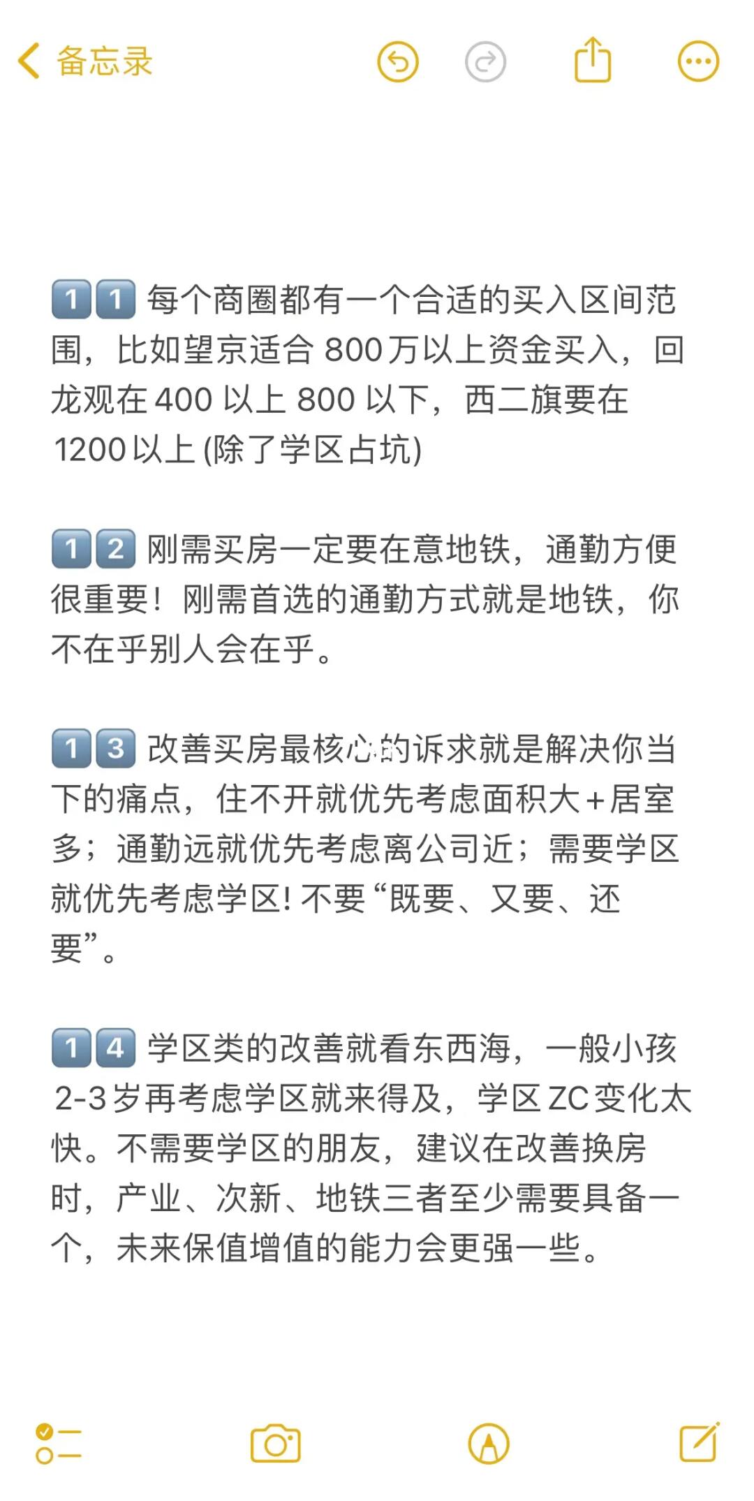 1️⃣1️⃣ 每个商圈都有一个合适的买入区间范围,比如望京适合 800万以上资金买入,回龙观在400 以上 800 以下,西二旗要在1200以上(除了学区占坑)