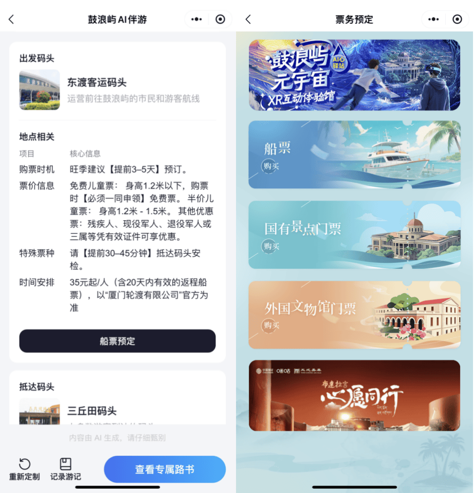 在票务方面,游客可以通过「鼓浪屿元宇宙」小程序,查询到从船票到景点、博物馆门票的所有资讯,也可以让「小蘑菇」生成符合游客喜好的路线,一键直达购票系统,省去了繁琐的筛选过程。