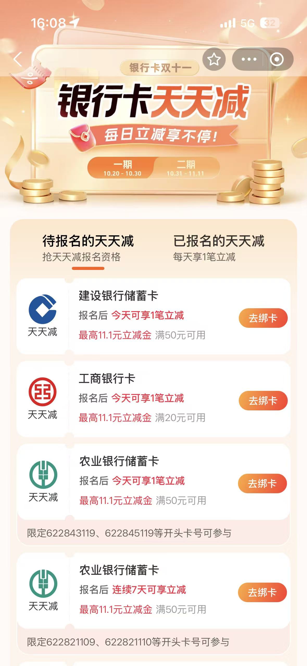 从参与今年“双十一”消费旺季的银行类型来看,国有银行、股份制银行及城商行的身影都出现在促销活动中。例如,近期支付宝上线的“银行卡天天减”活动中,既有建设银行(601939.SH)、工商银行(601398.SH)、交通银行、农业银行等国有大行,也有中信银行(601998.SH)、上海银行(601229.SH)、江苏银行(600919.SH)、哈尔滨银行(06138.HK)等股份制银行和城商行。