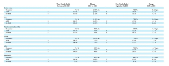 美国地区入住率为74.5%,同比下降1%;ADR为169.51美元,同比下降0.9%;RevPAR为126.23美元,下降2.3%。
