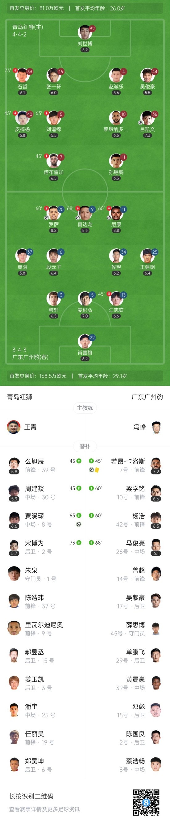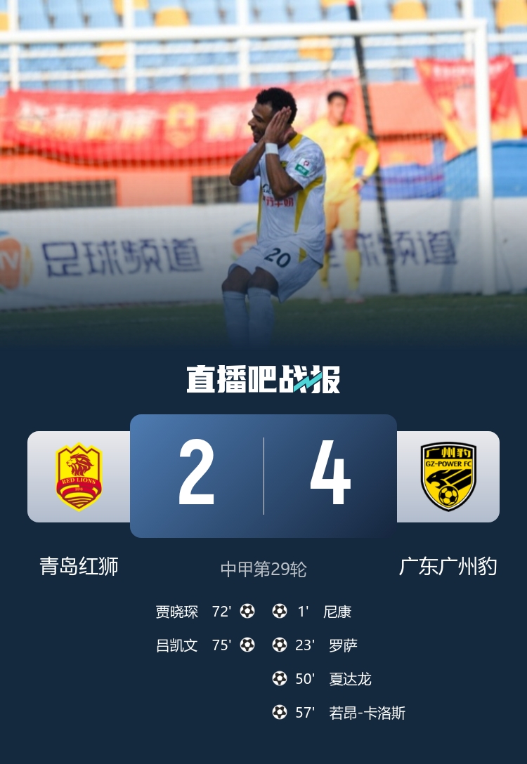 下半场补时6分钟,青岛红狮2-4广东广州豹。