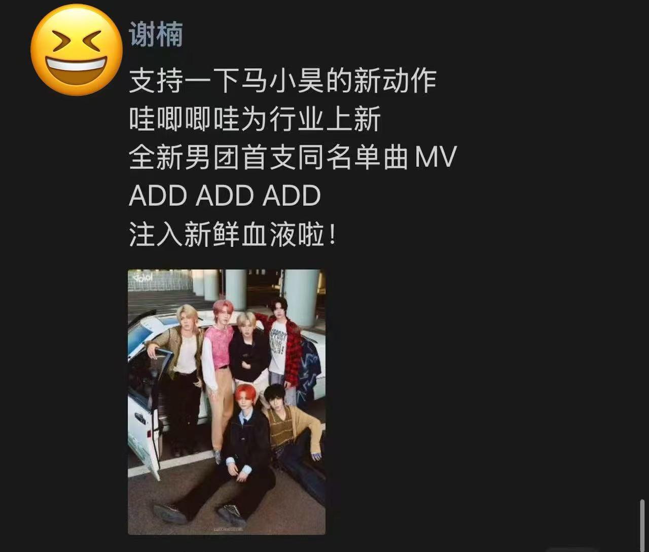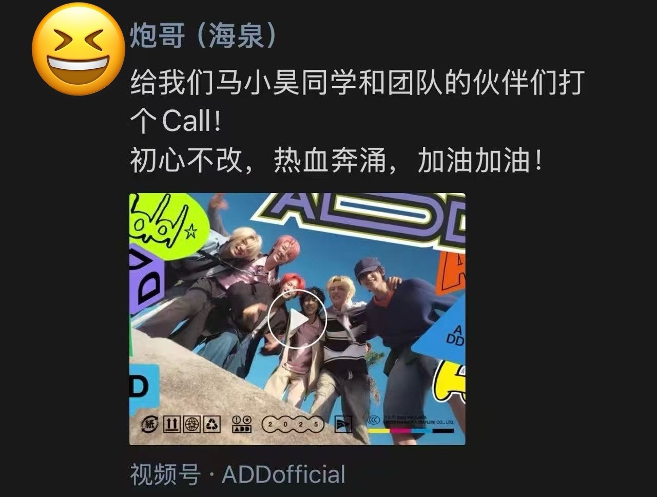 不止明星前辈,行业端也超给ADD面子!海泉专门点名“给马小昊同学和团队打call,初心不改,热血奔涌”,车澈干脆直接发“期待”,字里行间全是认可!要知道这是哇唧唧哇忙活五年才推出的团,连行业大佬都盖章,这品质感看着就靠谱,MV必须冲一波!众星朋友圈狂推哇唧新男团