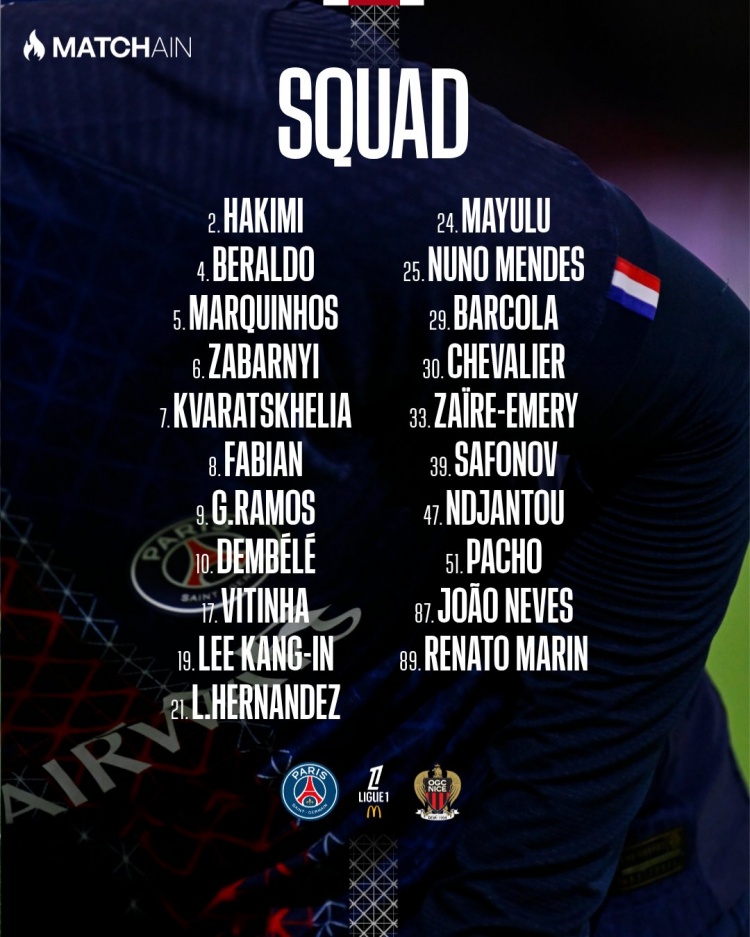前锋:7-克瓦拉茨赫利亚、9-贡萨洛-拉莫斯、10-登贝莱、19-李刚仁、29-巴尔科拉、47-恩贾恩图