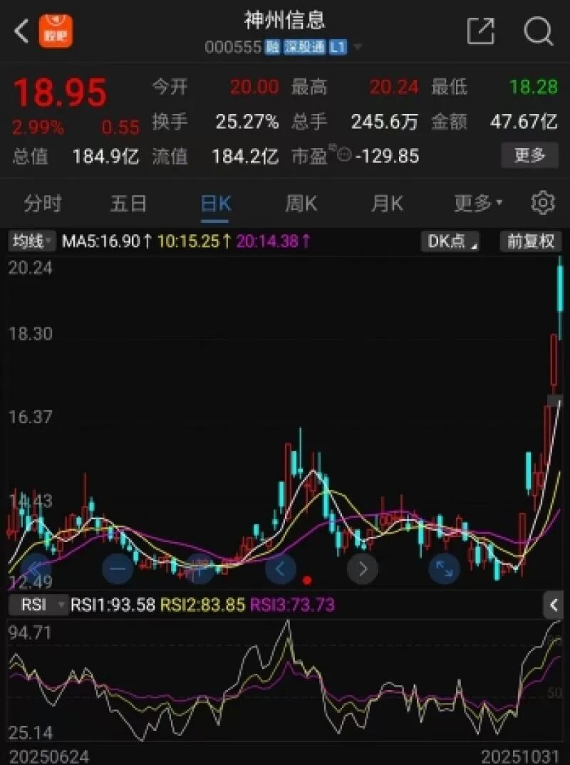 利好信号迅速传导至资本市场,A股量子科技概念板块全面爆发,多只个股表现强势。其中,神州信息短期内股价大幅攀升,6个交易日内揽获了3个涨停,成为板块内的热门标的。10月30日晚,神州信息对外发布了股票交易异常波动公告,称目前公司经营活动正常,内外部经营环境未发生或预计将要发生重大变化等。31日,该股高开震荡,最终收涨约3%。