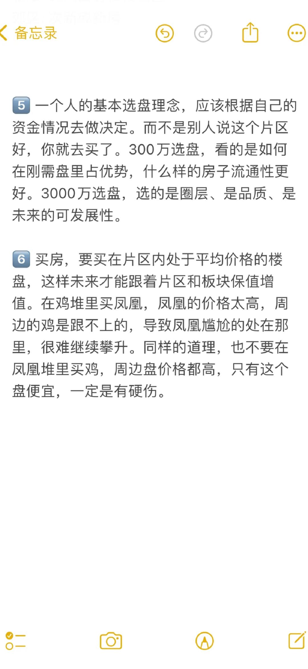 5️⃣ 一个人的基本选盘理念,应该根据自己的资金情况去做决定。而不是别人说这个片区好,你就去买了。300万选盘,看的是如何在刚需盘里占优势,什么样的房子流通性更好。3000万选盘,选的是圈层、是品质、是未来的可发展性。