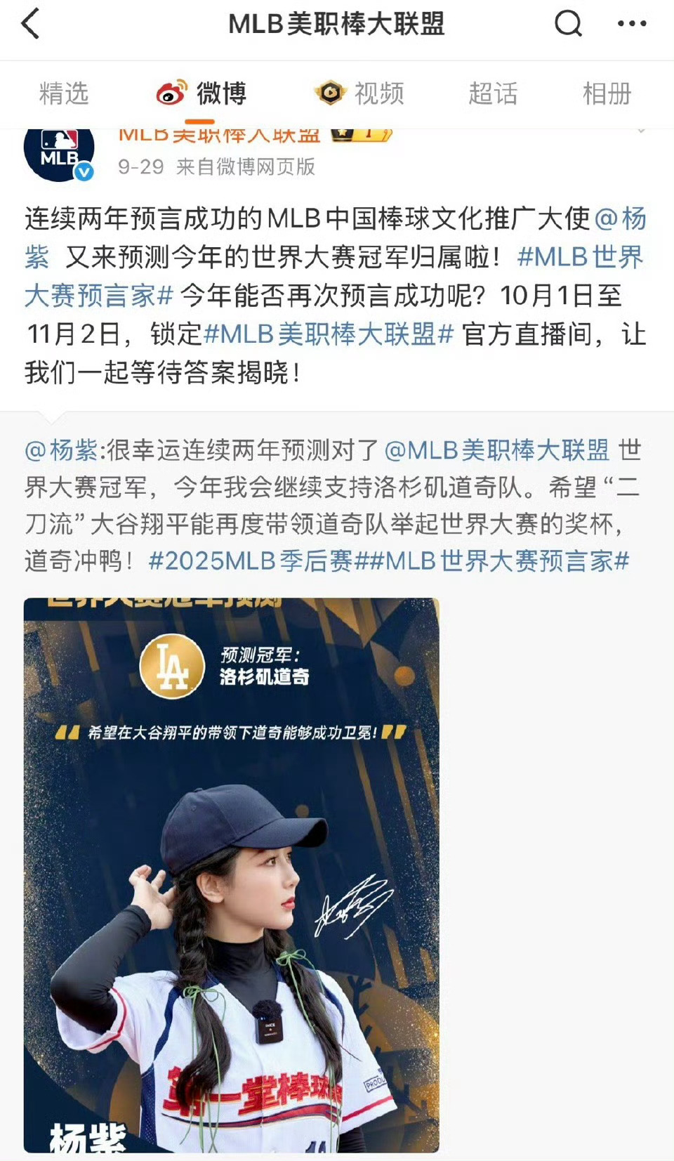 没想到杨紫还有这实力![柯基][柯基][柯基]杨紫连续三年说准MLB冠军