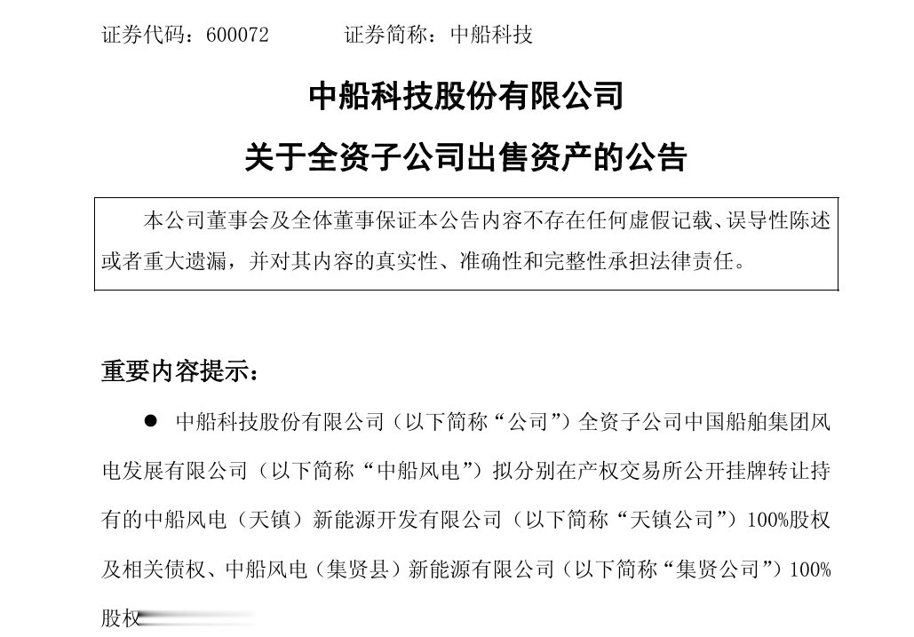 公告披露,2025年10月30日,中船科技召开第十届董事会第十七次会议,审议通过《关于公开挂牌转让中船风电(天镇)新能源开发有限公司100%股权及相关债权的议案》《关于公开挂牌转让中船风电(集贤县)新能源有限公司100%股权及相关债权的预案》。