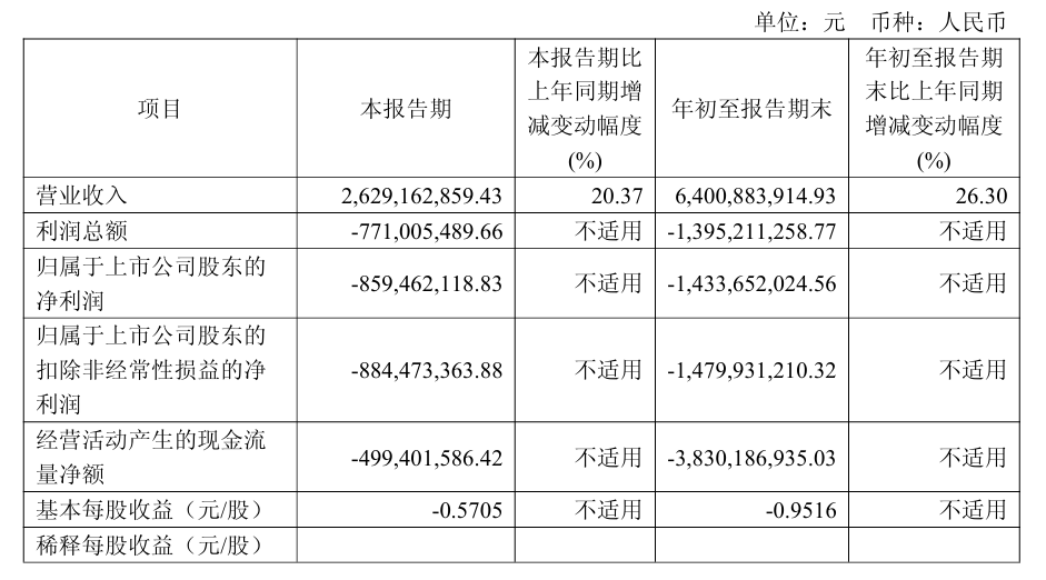 其中,2025年第三季度,公司实现营业收入26.29亿元,同比增长20.37%;实现归属于上市公司股东的净利润-8.59亿元;实现归属于上市公司股东的扣除非经常性损益的净利润-8.84亿元。