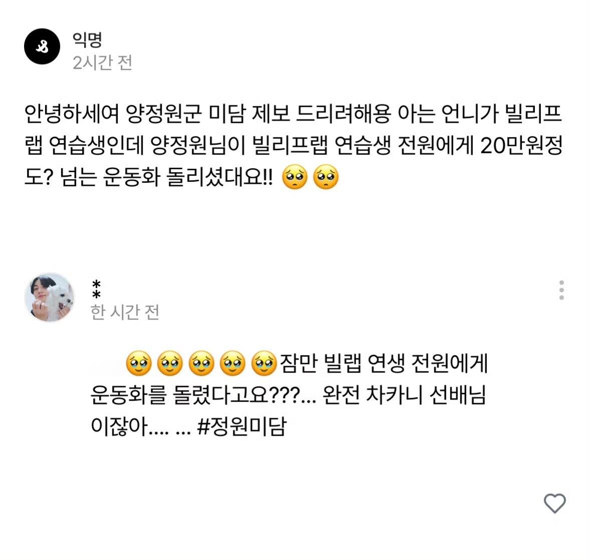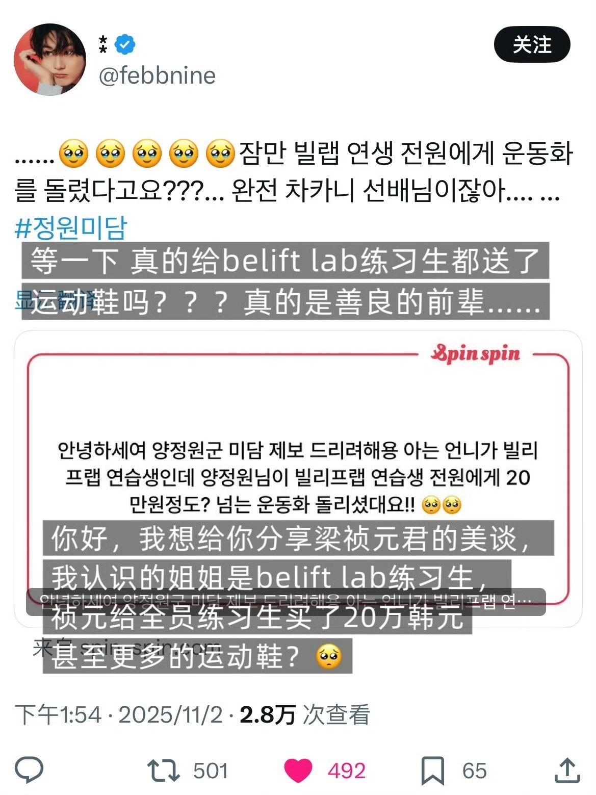 “您好,我来提供梁祯元君的美谈情报。认识的姐姐是Belift Lab 的练习生,梁祯元nim给Belift Lab 每位练习生都送了单价20w韩元以上的运动鞋呢”,祯元一直都是很好的人吧!