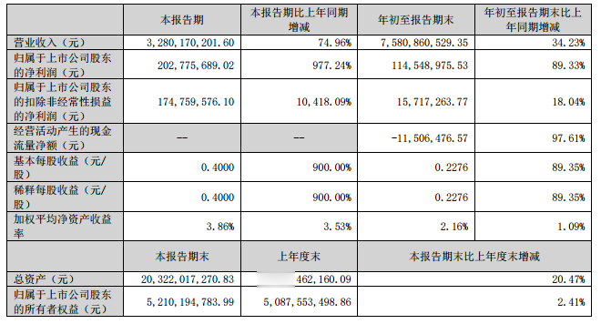 其中,第三季度,鹏辉能源实现营收32.80亿元,同比增长74.96%;净利润2.03亿元,同比增长977.24%;扣非净利润1.75亿元,同比增长高达10418.09%。