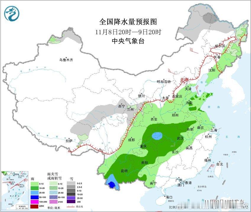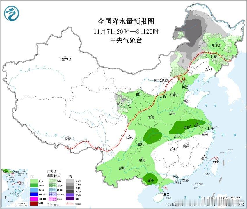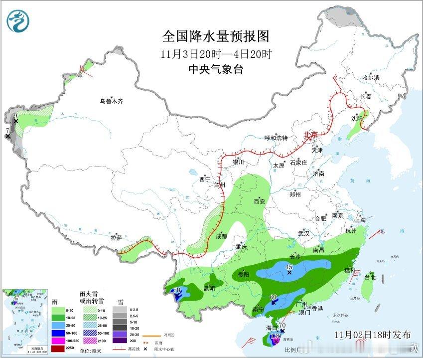 预计11月2日20时至3日20时,西藏东部、青海南部、甘肃南部、川西高原北部等地部分地区有小到中雪或雨夹雪。江南南部、西南地区南部、华南北部和海南岛等地部分地区有中到大雨,其中,贵州东南部、云南中部等地部分地区有暴雨(50~90毫米)。