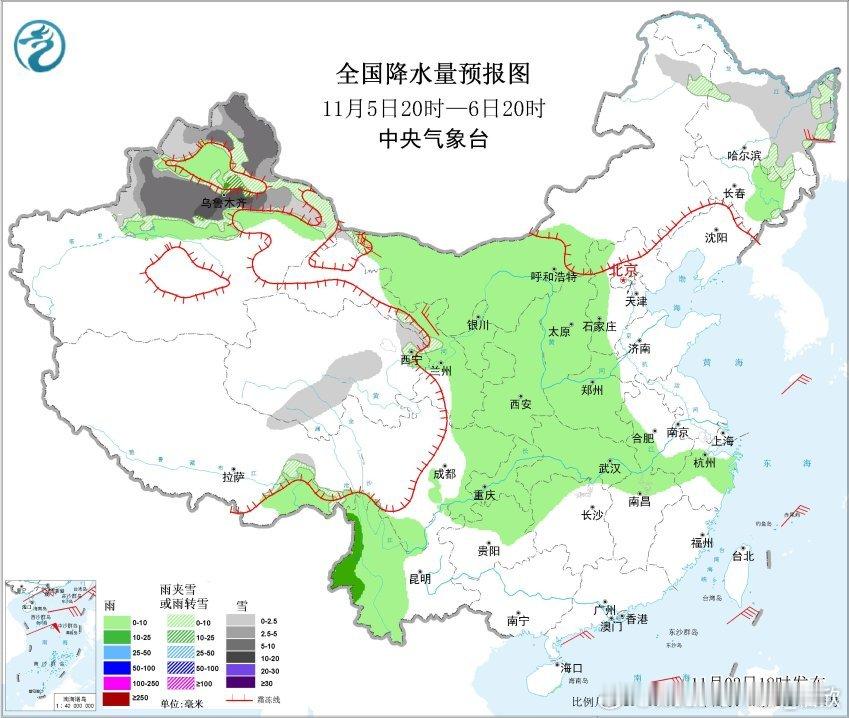 预计11月4日20时至5日20时,内蒙古东北部和中部、黑龙江西北部和中南部、新疆沿天山地区、伊犁河谷和南疆西部山区、西藏西部和中南部、青海中西部等地部分地区有小到中雪或雨夹雪,其中,新疆北疆北部和伊犁河谷等地部分地区有大到暴雪,局地大暴雪(20~28毫米),新增积雪深度4~12厘米,局地15厘米以上。