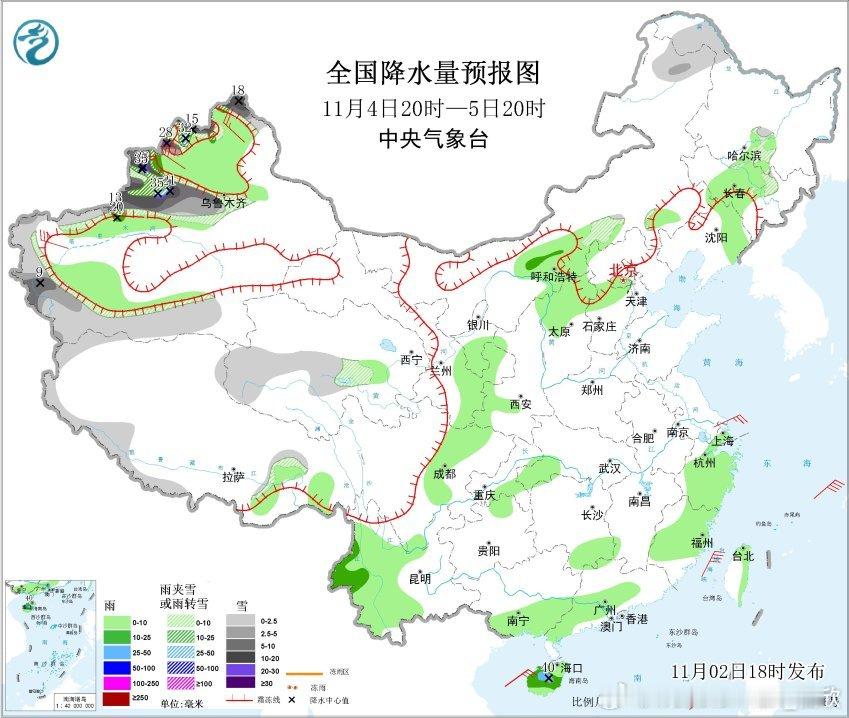 预计11月3日20时至4日20时,新疆北部和西部山区、黑龙江西北部、西藏南部、川西高原北部等地部分地区有小到中雪或雨夹雪,其中新疆南疆西部山区部分地区有大雪(5~9毫米),新增积雪深度2~5厘米。云南西部和东北部、贵州东南部、湖南南部、江西南部、福建中北部、华南中部以及海南岛等地部分地区有中到大雨,其中,云南西部、广西中东部、海南岛东南部等地部分地区有暴雨或大暴雨(100~130毫米)。