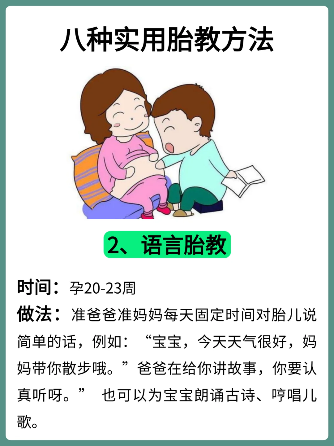 准爸爸在给宝宝做胎教时候,可不要只会说,我是你爹啦 学会这样做胎教,让宝宝赢在起跑线 不要想当然认为胎教仅仅是音乐和故事,它是一种全方位的爱的传递。 可以通过触摸、声音、光线和情感的交流,让准爸爸和准妈妈与宝宝建立一种特殊的联系 📖研究表明,正确且适当的胎教可以提高宝宝的听力、语言能力和记忆力。所以,不要偷懒啦,从今天开始,用你的声音、你的故事、你的爱,去触摸宝宝的心灵,让他们在出生前就感受到这个世界的美好~