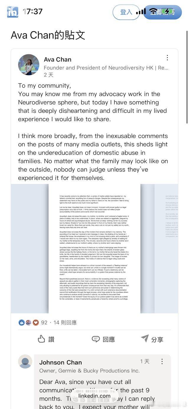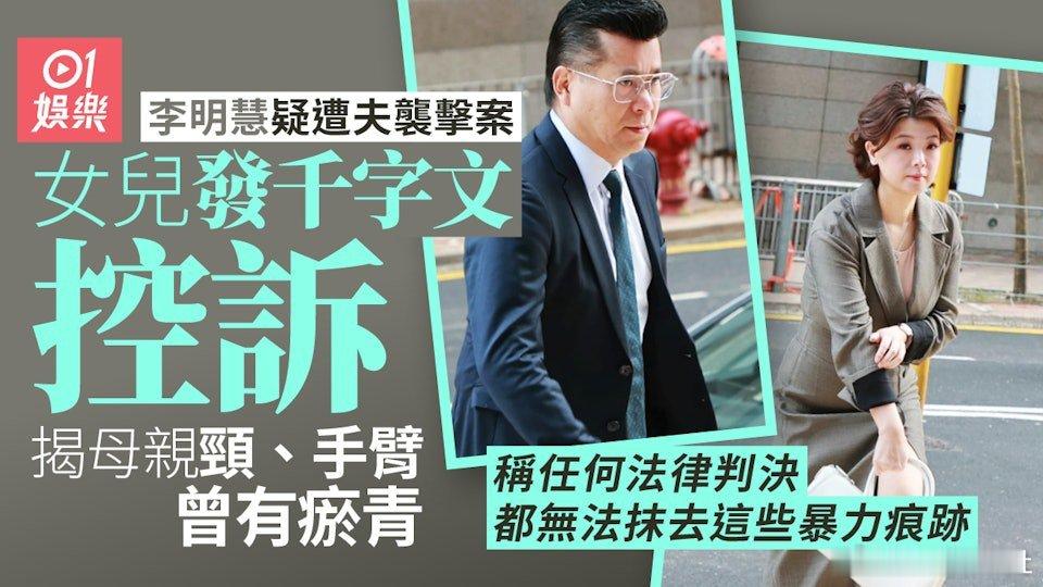 案件審結後,李明慧的女兒Ava在社交平台發出千字長文,揚言要揭露真相,她認為無罪釋放並不意味着清白,無罪推定是一種法律原則,而非事實,也無法抹去曾經發生的一切。Ava在文中揭露過去一直如履薄冰,長期遭受言語同精神虐待,令她感到害怕及大受傷害,她回憶母親被迫離開屋企,物品被丟入垃圾袋,地板上散落碎玻璃,而母親的頸上、手臂和肩膀上都有瘀青,認為任何法律判決都無法抹去這些暴力的痕跡。