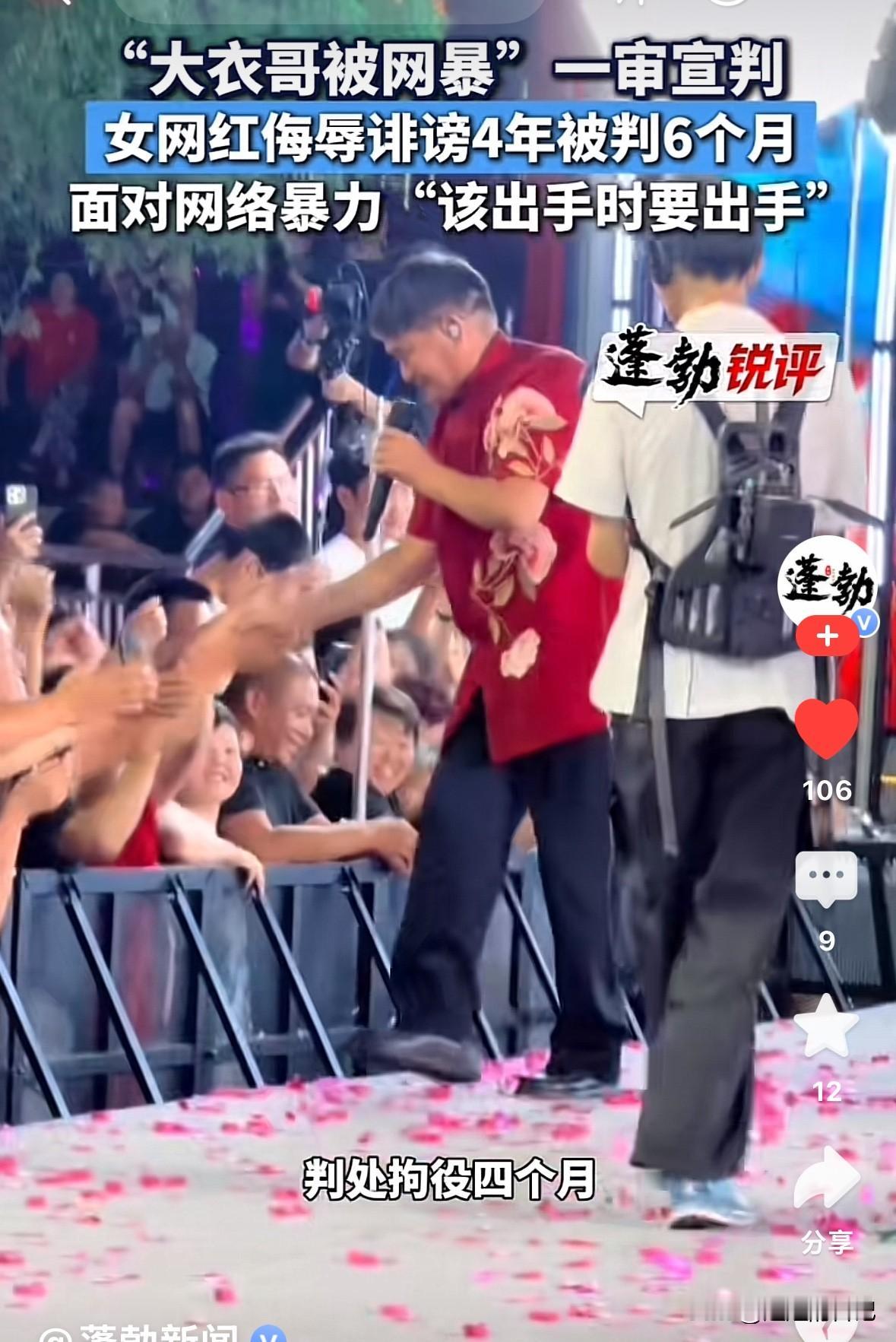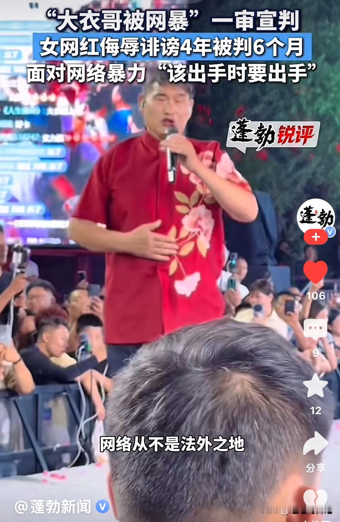 一女子网暴大衣哥4年,憨厚的大衣哥一直默默的忍受,终于忍无可忍,将女子起诉最终女子喜提6个月特殊对待,活该。 很多人就利用别人的善良,不跟她计较就肆无忌惮的攻击网暴别人,更有一些自认为自己,有知识,有文化,却与法律背道而驰,冒着自己喜提集体生活的风险,恶意攻击互不相干,根本不认识的她人,真不懂这些人为啥骨子里那么恶毒,那么坏。 我认为,有些人的所作所为,就算你不计较,老天也会给她相应的惩罚,但是,对于有些人,真不应该迁就,有时候忍让,就是纵容,就应该拿起武器保护自己的合法权益。 大衣哥起了一个非常好的带头作用,我有时候就是嫌麻烦,但是现在想想,有些人就应该像这个女人一样,零容忍就对了。 网络取证非常简单,真不知道有些人怎么那么大的胆子,甚至有些人被人利用还不自知。自己成了笑话,还呲牙笑话别人呢。