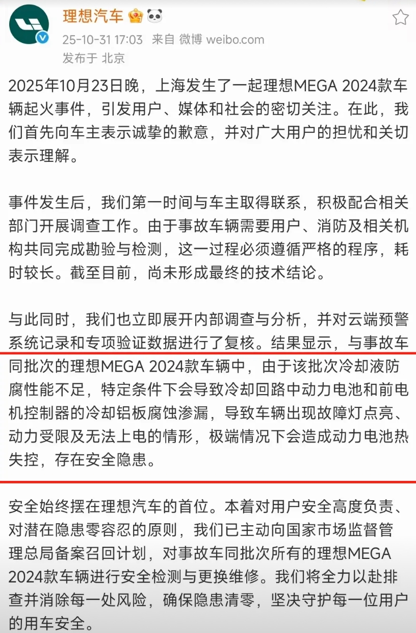 理想回应Mega其实就是冷却液漏了,电池没制冷了直热失控,说白了就是产品本身的缺陷……说是冷却液把冷却铝板给腐蚀漏了,业内都用的冷却铝板,我猜测理想可能用了一种性能更好的冷却液,但是没想到这个冷却液腐蚀性出乎意料了…… 其实本质就是实验室验证没做好,新势力的本质就是整合快、出品快,这是互联网产品的特点,大部分没问题就凑合用,有问题了再换,但这要是放在车上,就是人命关天的大事。快就意味着验证周期被压缩,用户变相成了免费的验证者。 理想的产品力很强这没话说,但在基础部件验证、安全可靠性及预案上,和传统大厂的标准、流程还是有明显差距,这点其实所有新势力都一样。给监管总局备案的召回编号是 S2025M0174V,S就是安全缺陷。
