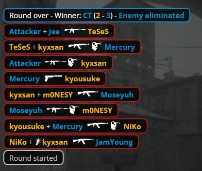 第20局Mercury香蕉道炸飞K3,京介香蕉道换掉小鞠,Monesy大狙在B红带哦白菜,天禄带包转A,Monesy书房回防,龙哥包点换掉Moseyuh,残局2v2,天禄在A下包,Jee小坑击杀Niko,但Monesy大狙狂轰双杀击杀Mercury与Jee后惊险拆包,天禄8-12猎鹰。