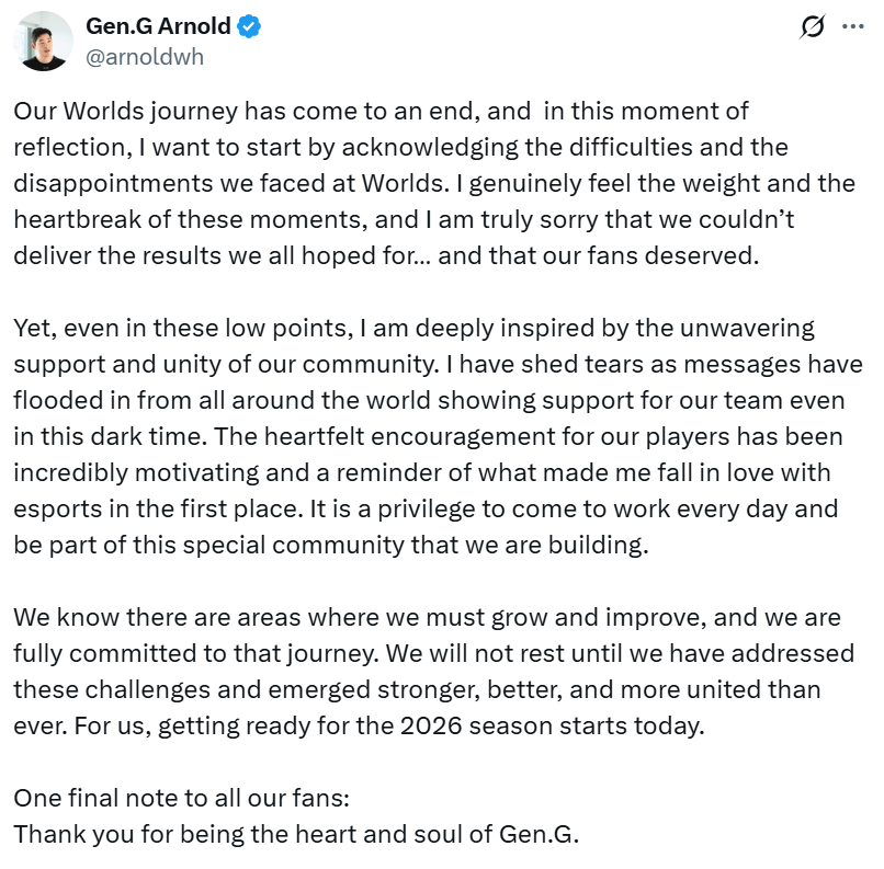 虎扑11月03日讯今日GENCEOArnold发文告别S15,具体如下: