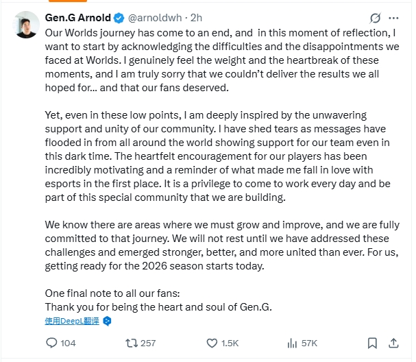 最后谨向全体粉丝致意:感谢你们始终是Gen.G的灵魂与核心。”