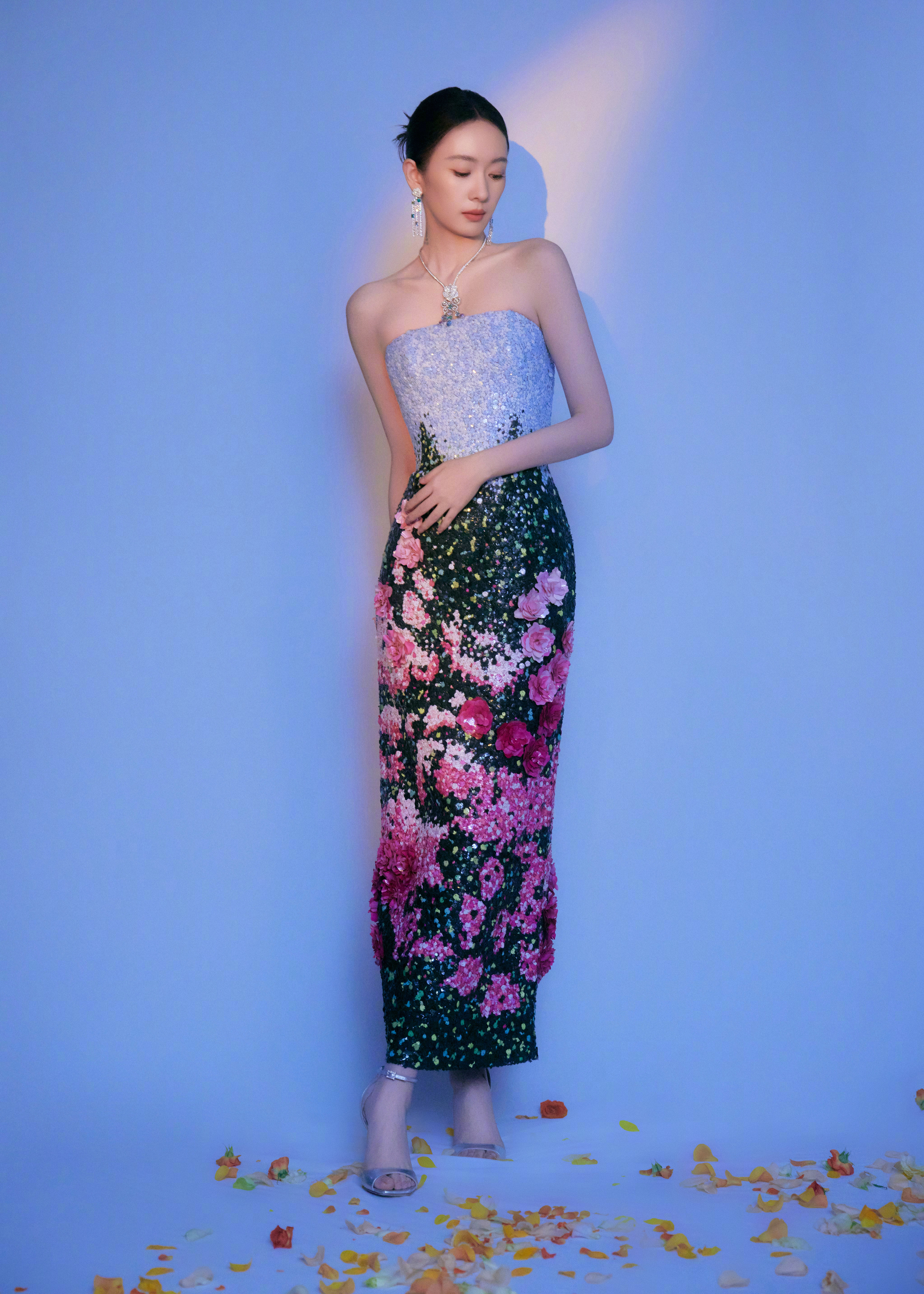 的微博视界大会 出发图造型,选择了一条立体玫瑰繁花裙。五十朵玫瑰在裙上如期绽放,