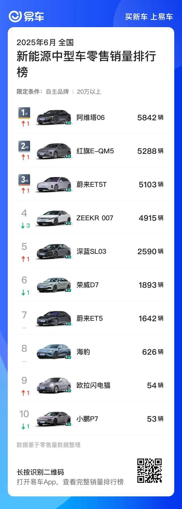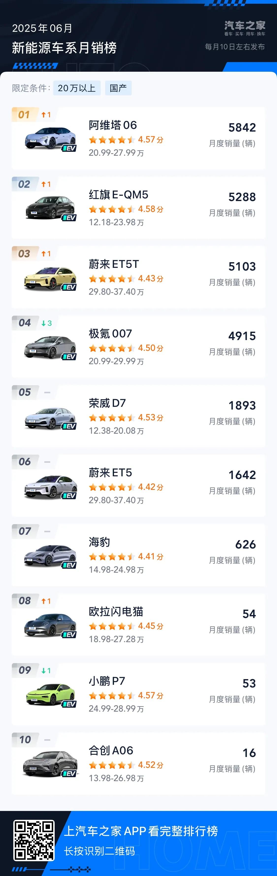 2025年6月新能源汽车月销数据发布:阿维塔06以5,842辆的月销量成绩,成功摘得20万元以上国产新能源中型轿车细分市场桂冠。这款承载着自主品牌高端化使命的智能电动轿车,凭借行业领先的智能驾驶系统、越级配置的豪华座舱体验,在用户满意度测评中斩获4.57分的高分评价。此次突破不仅打破了外资品牌与造车新势力长期占据的中高端市场格局,更标志着中国新能源汽车产业在技术突破与品牌向上进程中迈出关键一步。阿维塔06的突围印证了自主车企已具备重构中高端市场规则的硬核实力,为行业高质量发展注入强劲信心。