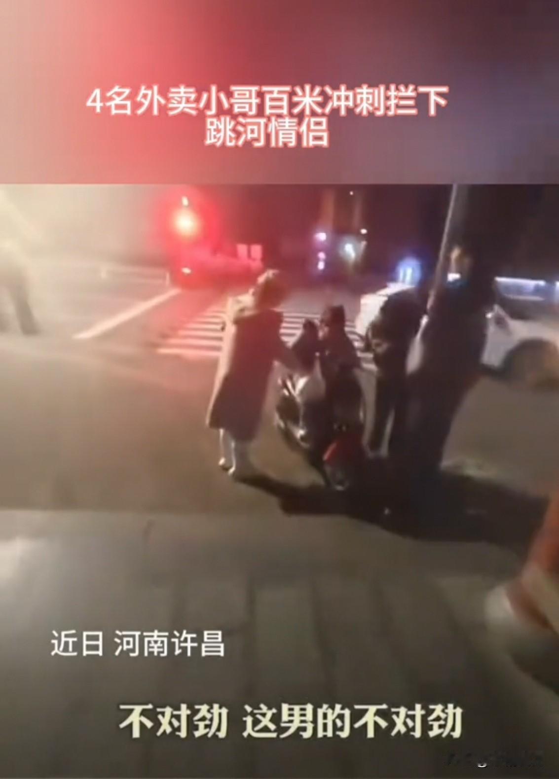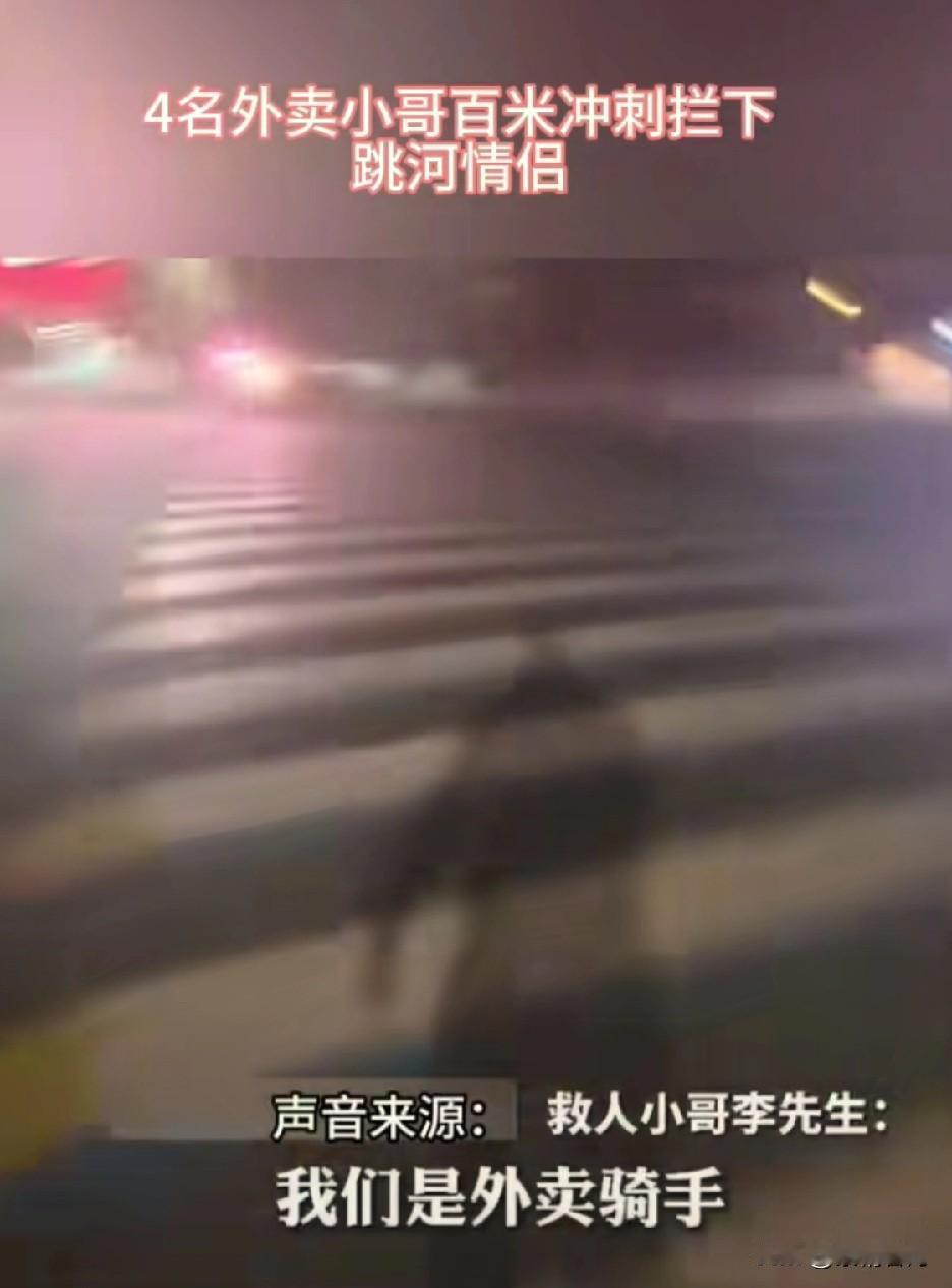 又是骑手救人!深夜的许昌建设路,4名年轻骑手在那等单,看着一对情侣吵架,谁料两人情绪越吵越激动,竟朝着河边走,男方还脱了衣服要跳河。 袁靖昂赶紧冲出去,李钱深、赵傲龙、安中强也百米冲刺的跑过去,合力把要跳河的男子拉了回来。这都已经够紧急了,结果一回头发现女方在车流里失控,他们赶紧用外卖车挡在路边打双闪,还喊来路人帮忙,把人护到安全处,后来帽子叔叔来了才放心离开。 后来平台和当地给他们发了奖,央视也报道了这事。骑手救人我印象中不是头一次了吧,万能的骑手总是在我们需要的时候出现!