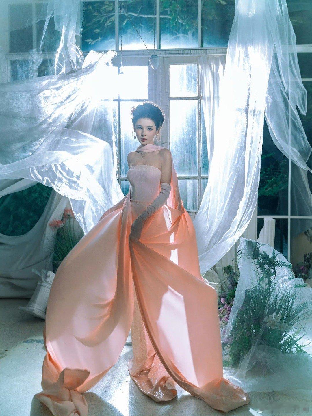 张予曦完全仙女来的 薄纱长裙缀满花朵,如晨露中的花瓣般清新。同色系盘发灵动飘逸,