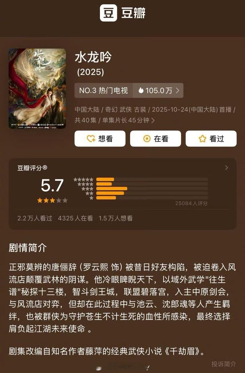 今日三部古装剧db开分龚俊《暗河传》7.1罗云熙《水龙吟》5.7宋茜、丁禹兮《山