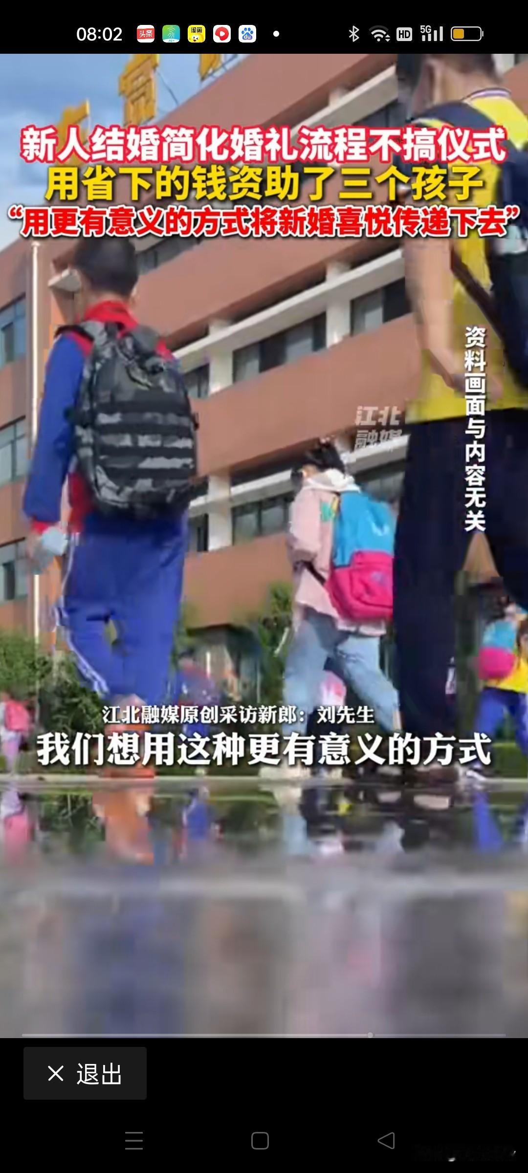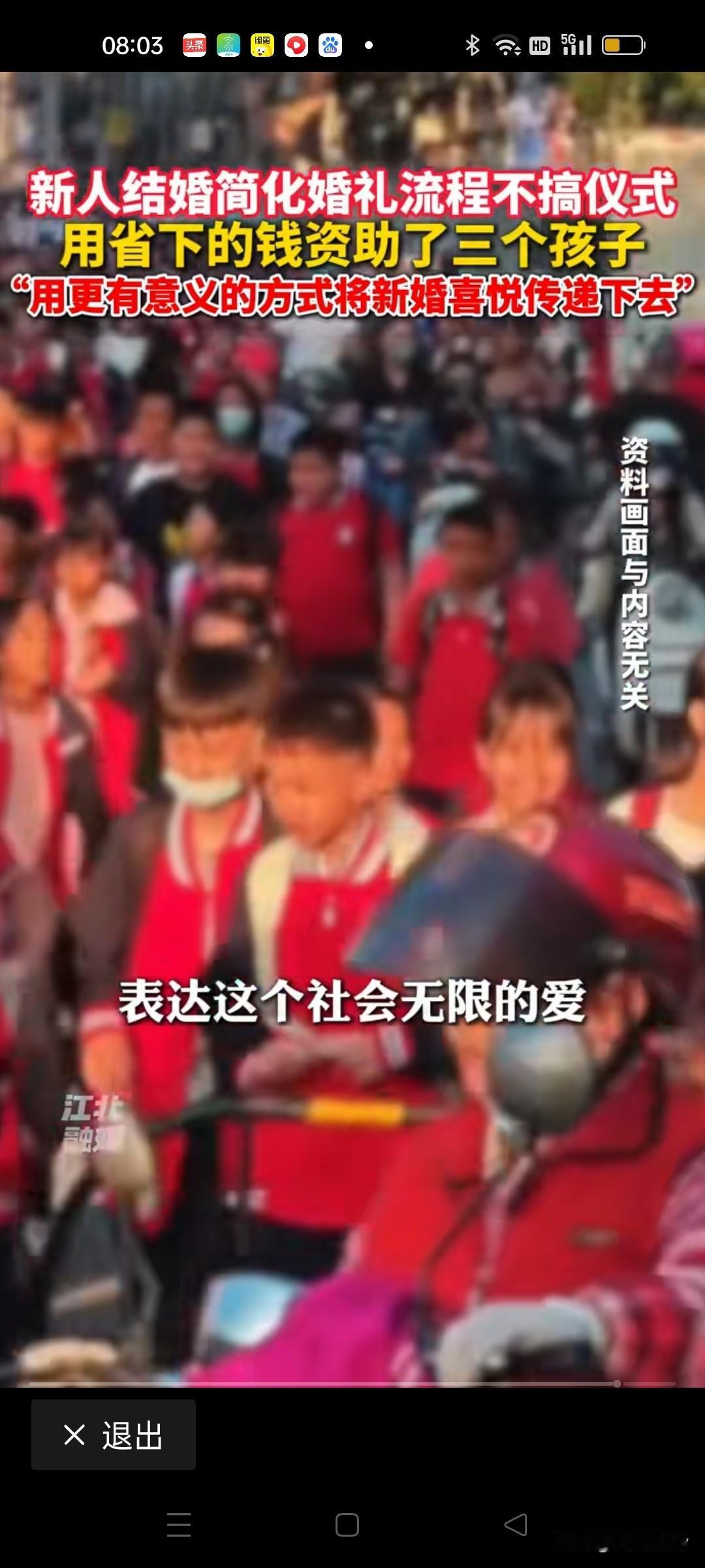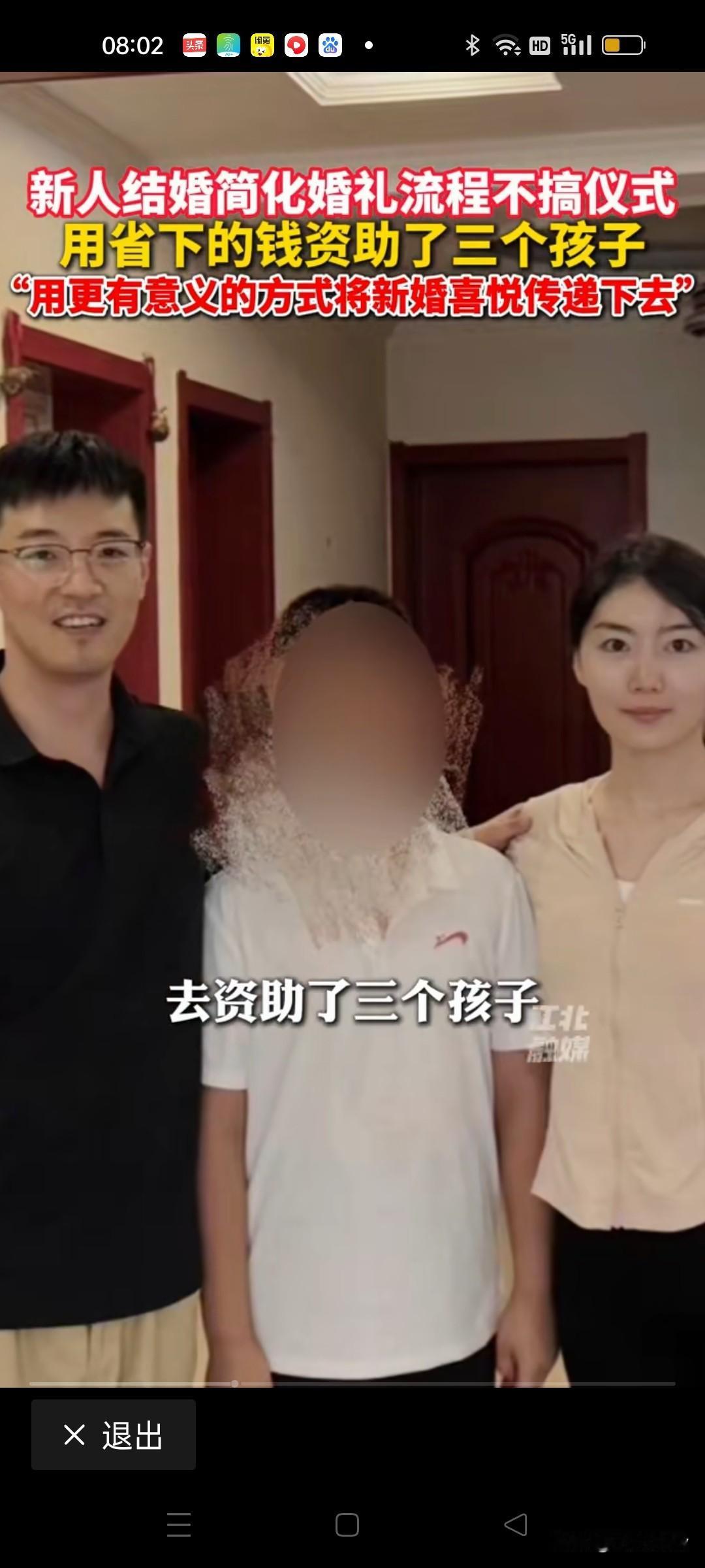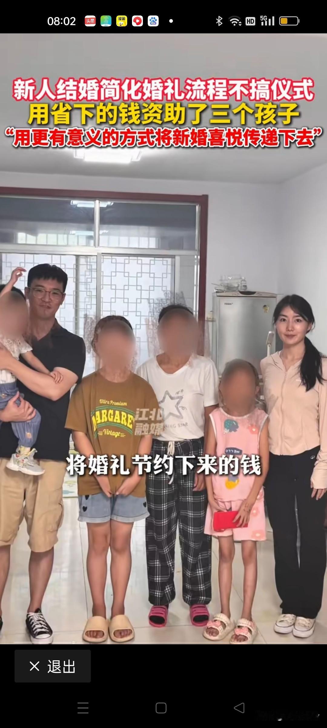 “这对新人结婚方式很特别”!9月1日,山东一对新人喜结连理,没有华丽的婚礼现场布置,也没有司仪,更没有摄影师,也没有请乐队和豪车车队,主打一个简单! 原来新郎刘先生和新娘婚礼前就商量好了一件大事,要把婚礼流程尽可能的缩短,把不必要的流程全部去掉,能不花钱的地方尽可能不花钱,就是为了把原本预算的费用拿出来支助三个陌生孩子,原来这三个孩子情况特殊,一个是因为父母残疾无力抚养;一个是孤儿;还有一个也是家庭变故没有经济来源。 新郎刘先生早就得知三个孩子的情况,但又面临人生最重要的结婚,如果资助孩子预算超支,婚礼势必要减少开支,对女朋友来说这种重要的人生大事举办的太草率,万一女朋友有意见怎么办? 当刘先生把自己的想法告诉未婚妻时,未婚妻不但没有反对,反而支持新郎刘先生的想法,两人不谋而合,于是这才把婚礼流程办成了极简风格。 常说,不是一家人不进一家门,不得不说刘先生和妻子都是非常有爱心的人士,她们婚礼的意义已经超越所有的婚礼形式本身。 那些个挥金如土,轰轰烈烈满城皆知的婚礼无非就是彰显家庭地位和经济实力,而对社会漠不关心他们简直是天差地别,而这对新人很特别的婚礼正彰显人性的伟大!最后祝有情人终成眷属!