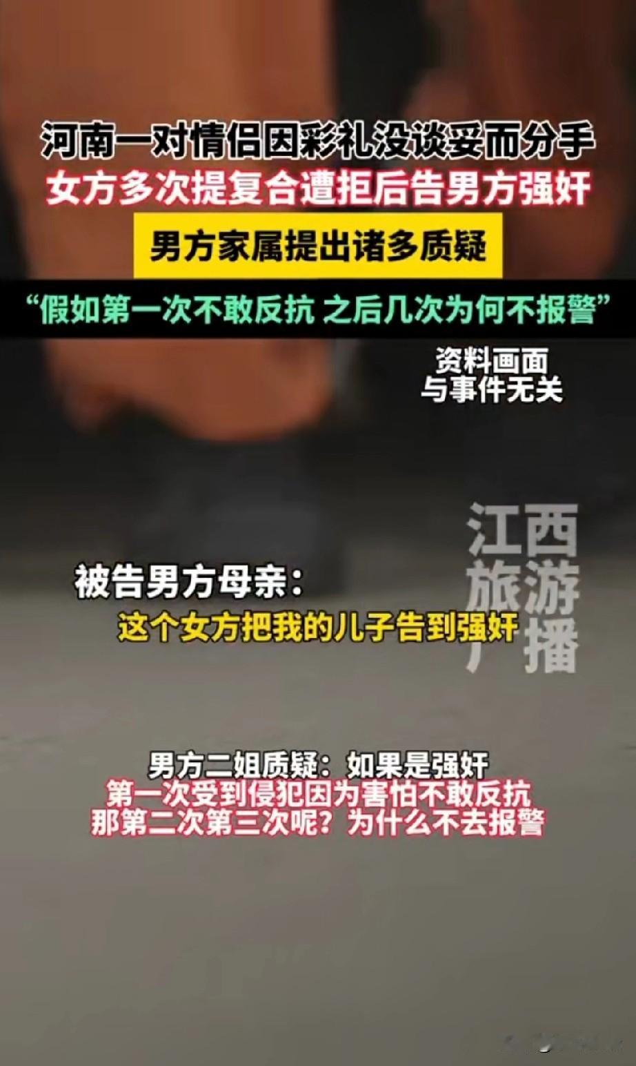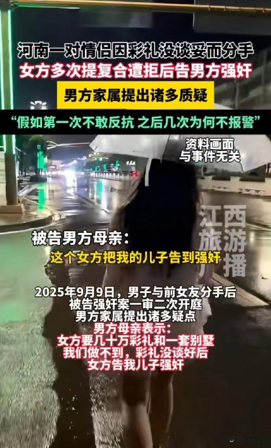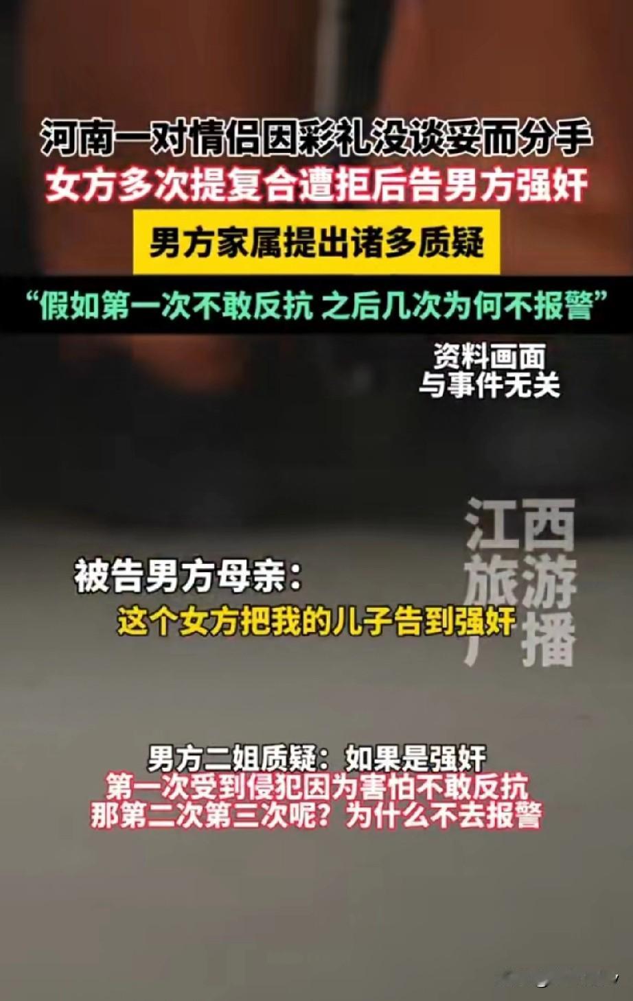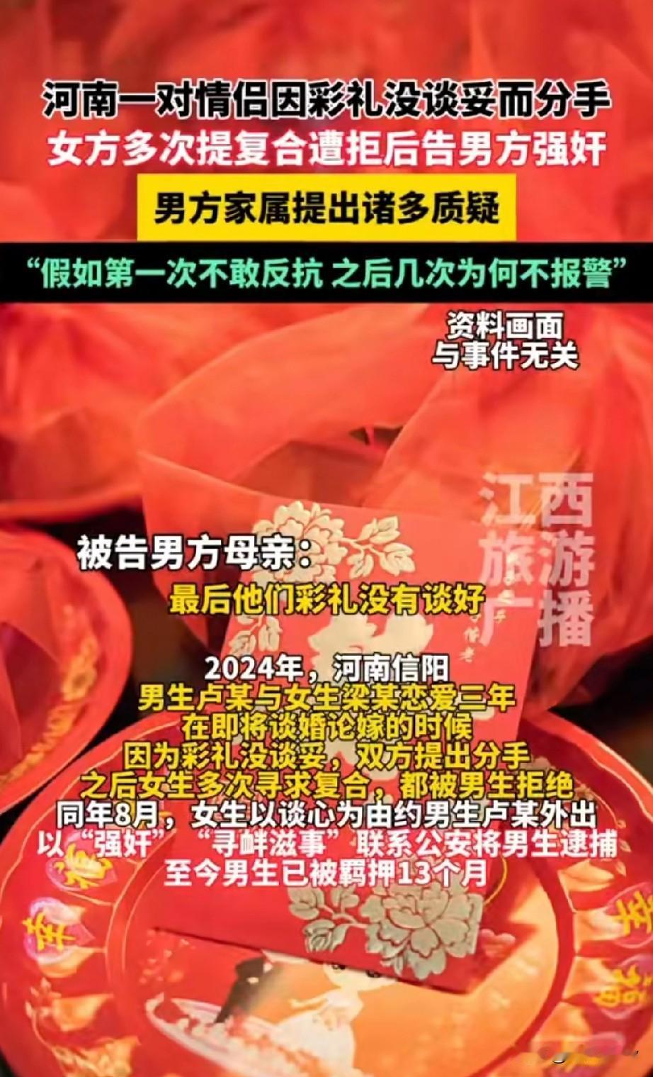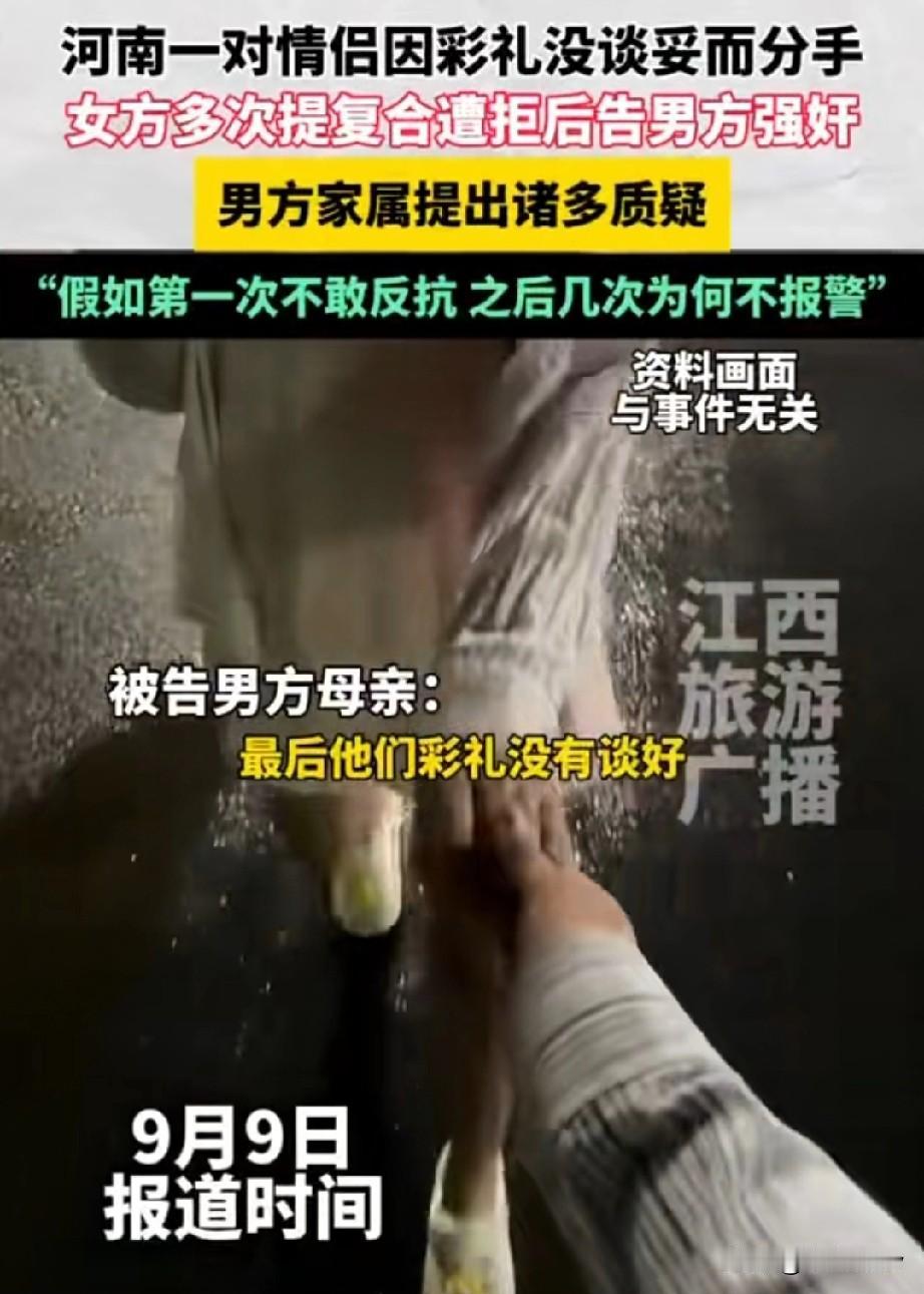 “不给彩礼就告男友强奸?”河南一对情侣因彩礼未谈妥分手,女子求复婚被拒索性报警告强奸!男子被羁押超一年,二审判决家属提出新质疑 (信息来源:江西旅游广播) 河南信阳男子卢某和女友梁某相识相恋3年有余,两人已经到了谈婚论嫁的地步,双方却因为彩礼没谈妥而被迫分手 根据男方卢某的母亲透露,女方家要求彩礼几十万另加一套别墅,而男方家觉得给彩礼,买住房没啥问题,可是几十万的彩礼再加一套别墅🏡,这成本太高了这才没有满足女方家的要求不得不分手。 两人分手后女子多次提出复婚但都遭到男方家忽视,女子多次以谈心为由约卢某外出同居,但对于女子复婚的要求卢某表示做不到,女子梁某经过多次沟通觉得无法挽回两个人的感情,于是报警称被卢某强奸,卢某被当地警方逮捕至今关押超过13个月。 2025年9月9日,当地法院以“强奸罪”二审开庭,庭上男方家属提出质疑“如果说第一次侵犯是不敢反抗,那么第二次第三次为何不报警?” 而男方家属的这一质疑确实值得商榷,法院该如何判呢? 强奸罪的构成主要指使用暴力、胁迫、恐吓或者其他手段对被害妇女的人身实行殴打、捆绑、堵嘴、卡脖子、按倒等危害人身安全的方式进行性侵犯。 对于男方卢某母亲表示的女方不仅要求几十万彩礼还要一套别墅的说法究竟是不是一面之词呢? 那女方在分手后又与男方多次约会且两人都多次发生了实质性的性行为,为何第一次没有报警告强奸而是几次后才报警?这其中又有什么隐情呢?如果卢某真的最终以强奸罪入刑是不是太冤了呢? 对于此事你有什么看法,欢迎讨论!