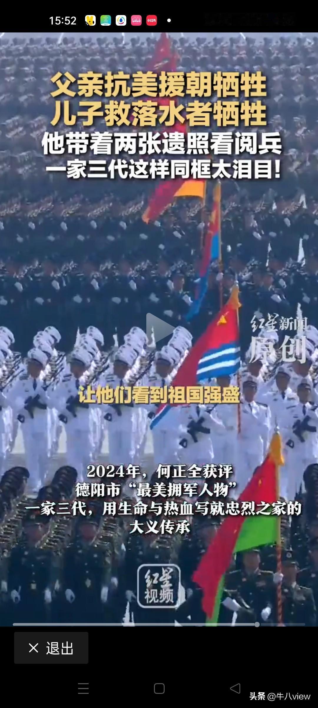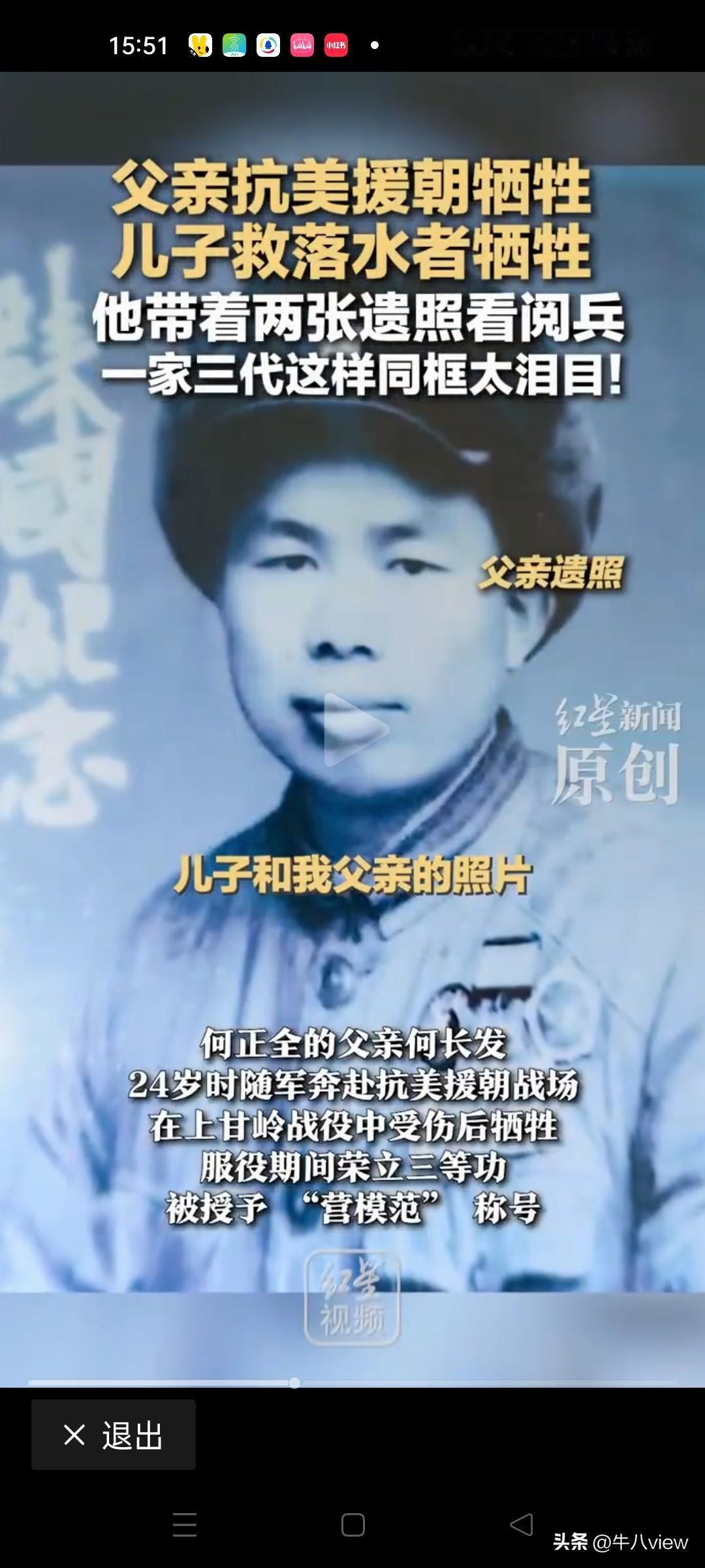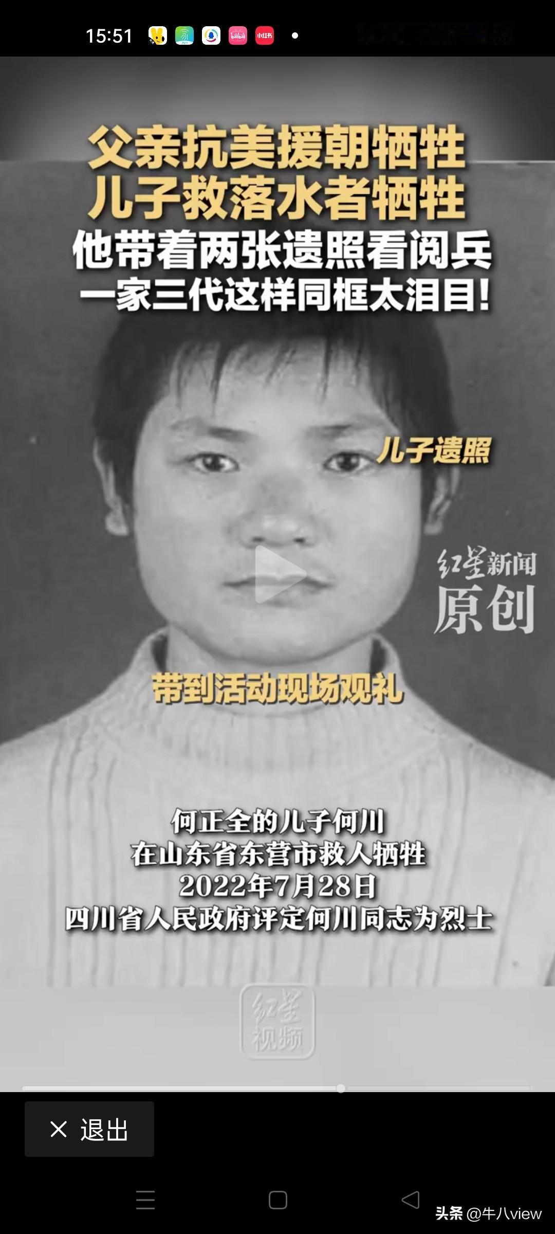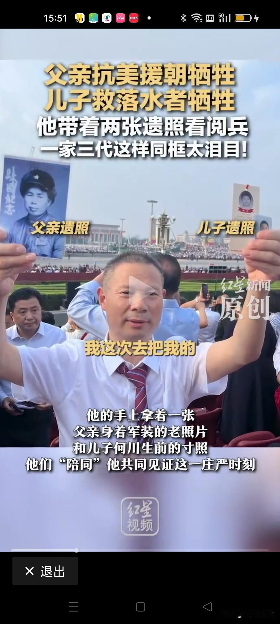 “让人泪目了!” 9月1日四川德阳男子何正全在北京天安门阅兵现场双手举着两张照片观看阅兵式,一个是抗美援朝牺牲的父亲,一个是在山东东营勇救落水儿童牺牲的儿子 ,何正全说,我要带着父亲和儿子一起看阅兵,让他们在天上看看我们国家今日之盛世,一起共同见证这庄严时刻,让他们看到祖国的强盛。 原来何正全是今年作为烈士家属受邀参观阅兵式的,他也表示非常激动,这是作为烈士家属的荣誉,也体现国家没有忘记曾经为国家立下汗马功劳的每一个革命者,更没有忘记新时代见义勇为的楷模。 这就是英雄家庭,这就是中华民族五千年薪火不灭的根本,也是中国人民不屈不挠,勇于牺牲,敢于奉献的民族精神。民族传承和国家的复兴就靠的是这样的一种精神一代一代的延续,生生不息! 人世间最悲痛的莫过于失去了父和子,一个是生我养我的亲人,一个是我生我养的亲人。 虽然我们生活在这个和平的国度,但英雄一直在我们身边涌现,当发生灾难,危险的时候总有人挺身而出,这些事迹是可歌可泣的,生在中国何其有幸,正是这些英雄们的无私奉献才护佑我们祖国日渐强大繁荣昌盛!