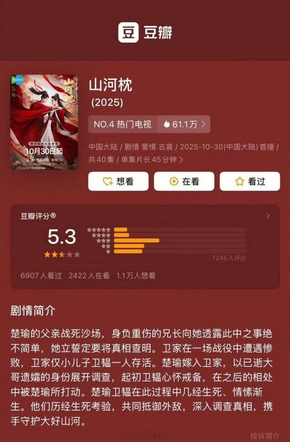 宋茜、丁禹兮《山河枕》豆瓣开分5.3分