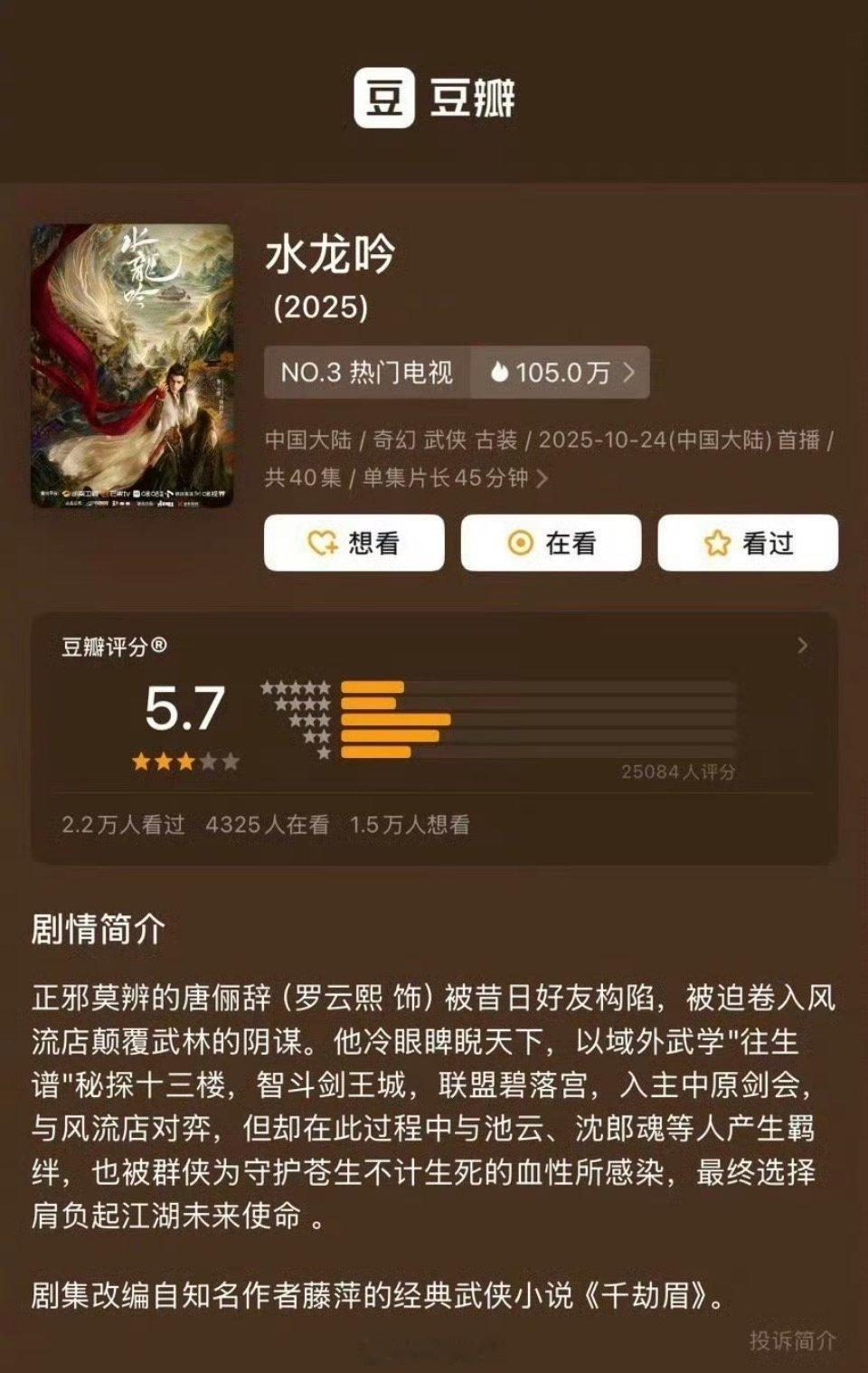 今天三部古装剧开分龚俊《暗河传》豆瓣开分7.1分罗云熙《水龙吟》豆瓣开分5.7分
