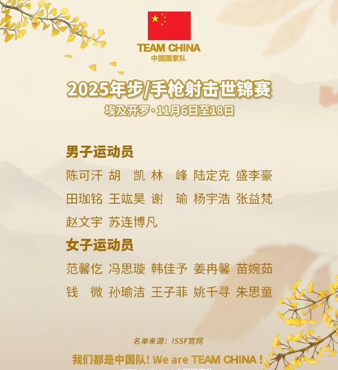 虎扑11月03日讯TEAMCHINA发布2025年步/手枪射击世锦赛中国队参赛运动员名单,多名奥运冠军入选。