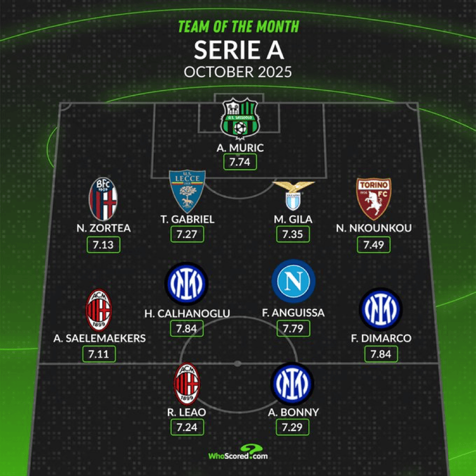 虎扑11月03日讯WhoScored根据球员评分,公布了意甲联赛的10月份最佳阵容。