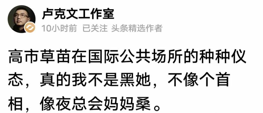 卢克文一句话,直接把高市早苗推上舆论火山口!一句“她不像日本首相,倒像夜总会妈妈桑”,不仅让日本“大值子”集体破防跳脚,疯狂留言谩骂讽刺,连中国网友都忍不住“拔刀相助”——不是帮她,是帮“妈妈桑”鸣不平! 特朗普访日那几天,高市早苗做的的确像个“妈妈桑”。当时特朗普去驻日美军横须贺基地的航母上演讲,高市早苗全程陪着,特朗普夸她是“胜者”“日本首位女首相”,她立马满脸堆笑,挥着手原地转了一圈打招呼,那股子热情劲儿,比见了自家亲人还热络。更让人咋舌的是,为了讨特朗普开心,她居然当众说要提名特朗普拿诺贝尔和平奖,这操作连日本媒体都看不下去,说她是在给特朗普“抬轿子”,做得太过分了。 “夜总会妈妈桑”的比喻,妙就妙在点透了这种“过度讨好的姿态”。大家印象里的妈妈桑,是招呼客人、维持场面的,但再热情也有自己的分寸和体面,不会丢了身份去巴结人。可高市早苗不一样,她是日本首相,本该代表国家的体面,却把自己活成了“狂热支持者”,特朗普走到哪儿她跟到哪儿,凑过去咬耳朵、挽胳膊,全程赔着笑脸,生怕招待不周。这种放下身段的奉承,可不就跟那种为了拉生意没底线的做派沾边了? 日本右翼先炸了锅,跳出来喊“恶意抹黑”,说卢克文是在侮辱日本首相。可他们的反驳没半点实在内容,翻来覆去就那几句“不懂外交礼仪”“这是美日友好的表现”。 结果话音刚落,日本自己的网友先反水了,网上骂声一片。有人说“看她跟在特朗普身后献媚的样子,我都觉得羞耻”,还有人更直接,骂她“像没底线的奴隶,哪有半点首相的样子”。有日本网民扒出细节,说她连安倍晋三都搬出来了,动不动就提“安倍生前和您关系多好”,处处捧着特朗普,简直把“谄媚”写在了脸上。这些吐槽可比卢克文的话狠多了,右翼想护短都护不住。 中国网友的补刀更是精准扎心,纷纷替“妈妈桑”鸣不平:“妈妈桑至少讲规矩、有体面,不会为了讨好别人连国家尊严都丢了”“人家妈妈桑是赚钱糊口,她这是拿国家利益换自己的政治资本,根本没法比”。 大家最气不过的是她的双重标准:对美国低三下四,对历史问题却硬气得很——否认南京大屠杀,说慰安妇是“自愿的”,还狂言当了首相一定要参拜靖国神社,把侵略历史说成“自卫战争”。一边对着外人摇尾巴,一边对着受害国耍横,这操作确实比“妈妈桑”的格局小多了。 其实高市早苗这么做,说白了就是想抱美国大腿。她本身在日本政坛根基不算稳,又没什么拿得出手的政绩,只能靠绑定美日同盟来巩固地位。知道特朗普喜欢被吹捧,就投其所好,又是提名诺奖又是全程陪笑,无非是想让美国多给她点支持,好在国内站稳脚跟。 可她忘了,首相的体面不是靠讨好外人换来的,日本网友骂她“丢颜面”,恰恰是戳中了要害——老百姓不管你跟美国关系多好,只看你有没有当首相的样子。 更讽刺的是,她这通操作连美国那边都没怎么领情。特朗普也就当面夸了她两句,转头就跟媒体说“日本得多承担点军费”,半点没客气。等于高市早苗热脸贴了冷屁股,还落了个“谄媚”的名声。有日本媒体算过账,为了招待特朗普,日本光安保费就花了好几亿日元,结果除了几句空泛的“美日同盟牢固”,啥实际好处都没捞着,反而让国际社会看了笑话。 这波舆论战之所以成了年度名场面,就是因为三方反应太有戏剧性:右翼急着护短却没理,日本网友先反水拆台,中国网友补刀精准。卢克文的比喻不过是点了个火,真正让高市早苗站不住脚的,是她自己那些没底线的操作。 说到底,大家骂的不是她个人,是那种“对外谄媚、对内强硬”的政客嘴脸。要是她能像个真正的首相那样,既维护好国际关系,又正视历史、尊重邻国,也不至于被人拿来跟“妈妈桑”对比,还让“妈妈桑”觉得委屈了。