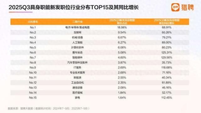 在具身智能职位的行业分布TOP15中,电子/半导体/集成电路、互联网、机械/设备、人工智能、计算机软件位列前五,构成其四大支柱:硬件之躯(机械/设备)、感官与神经(电子/半导体)、智能大脑(人工智能/软件)与连接生态(互联网)。从这TOP15行业具身智能职位同比增长来看,整车制造、智能硬件、IT服务、家电行业该类职位三季度增长均超100%。