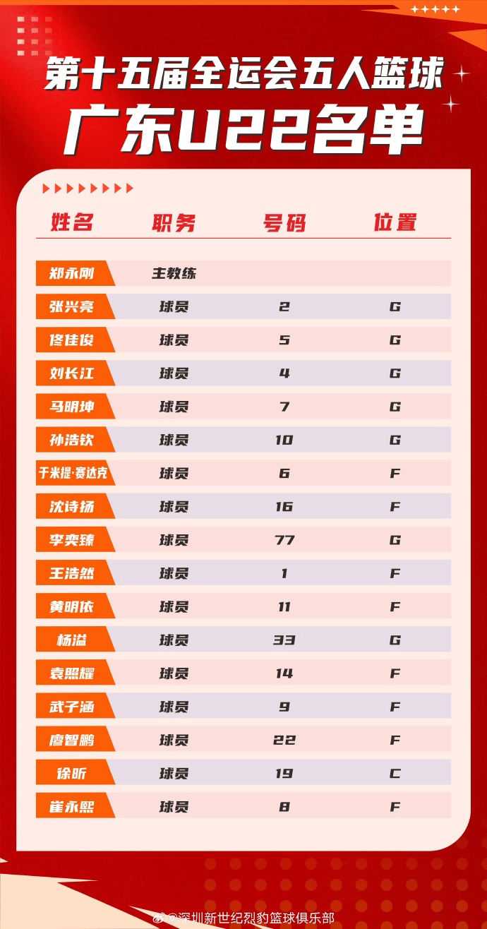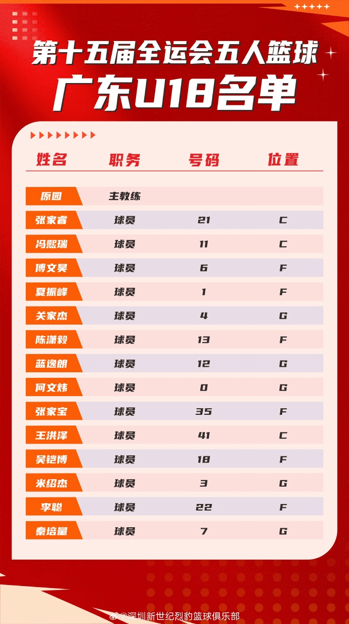 五人篮球项目男子U18组别将于11月10日至18日在澳门进行。本届广东U18男篮以深圳新世纪梯队为核心班底,由原园指导挂帅,一众青年才俊将全力冲击佳绩。”