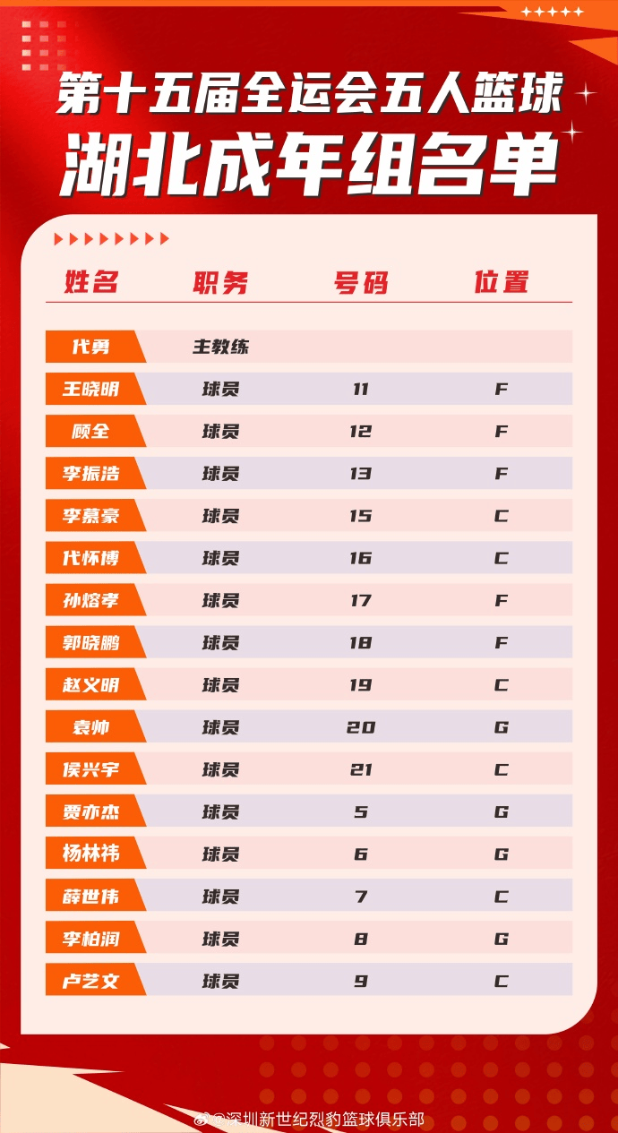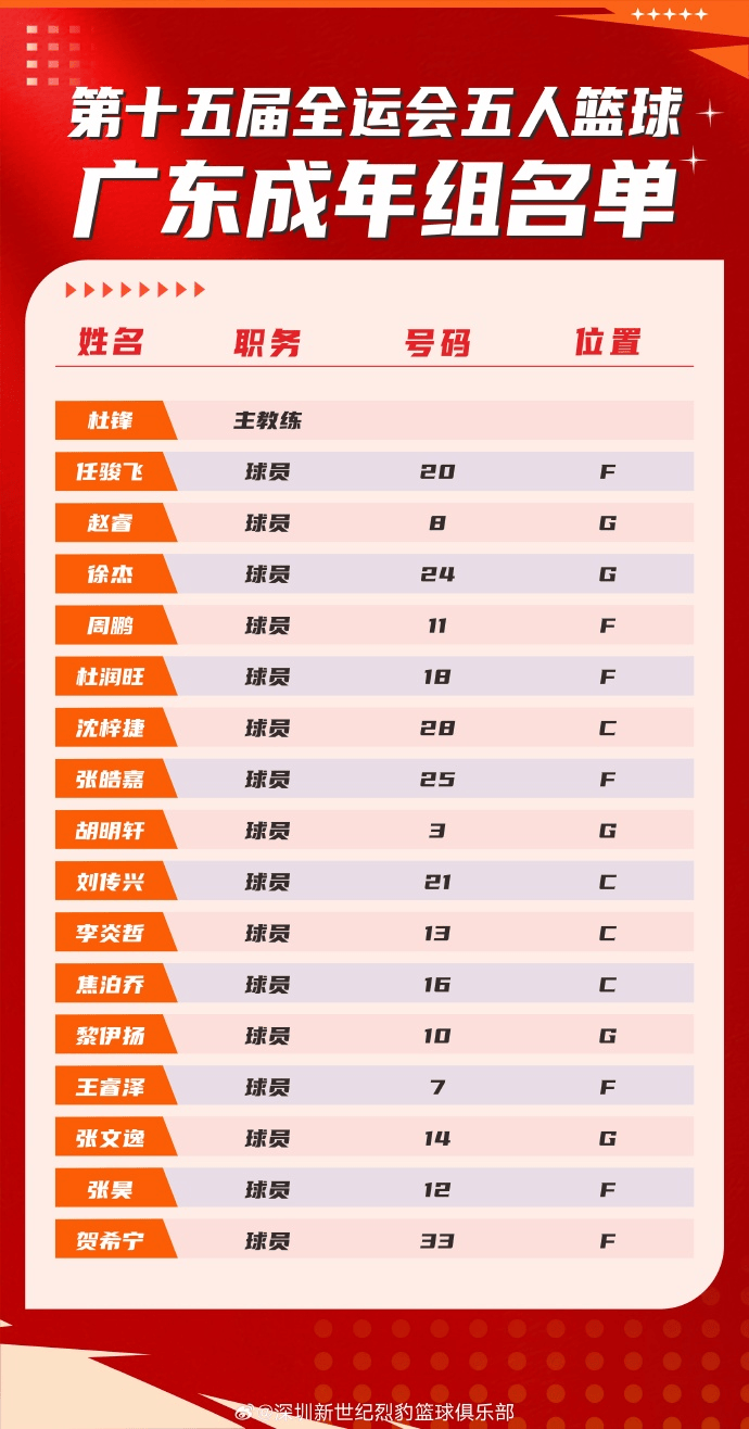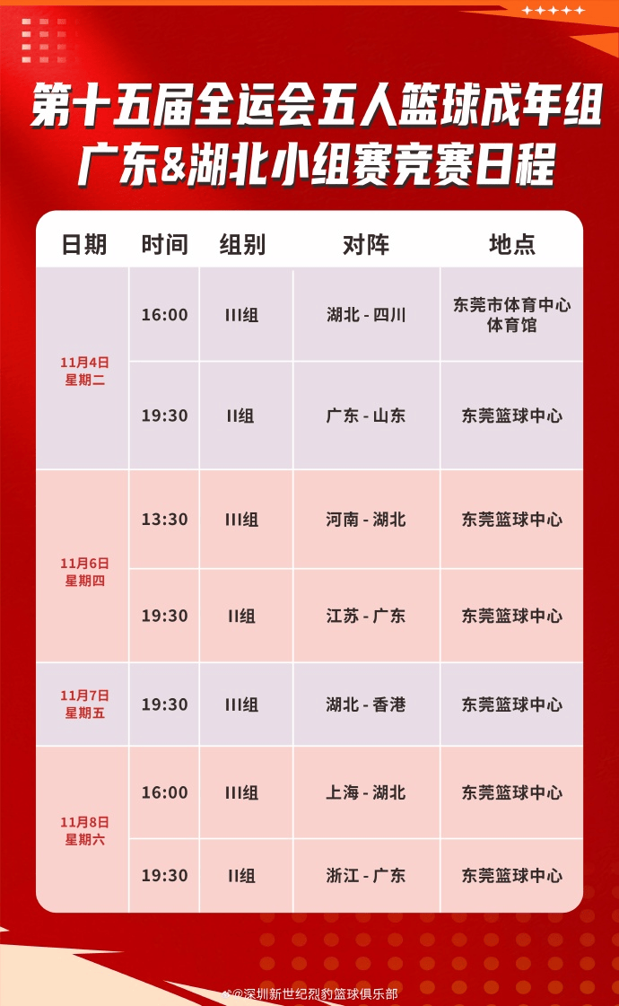 “第十五届全运会将于2025年11月9日至21日举行,由广东、香港、澳门三地携手联办,共襄体育盛事。五人篮球项目男子成年组比赛将于11月4日-12日在东莞进行。我俱乐部多名球员联袂出征:周鹏、贺希宁将身披广东队战袍,顾全、李慕豪、杨林祎则代表湖北队征战赛场。